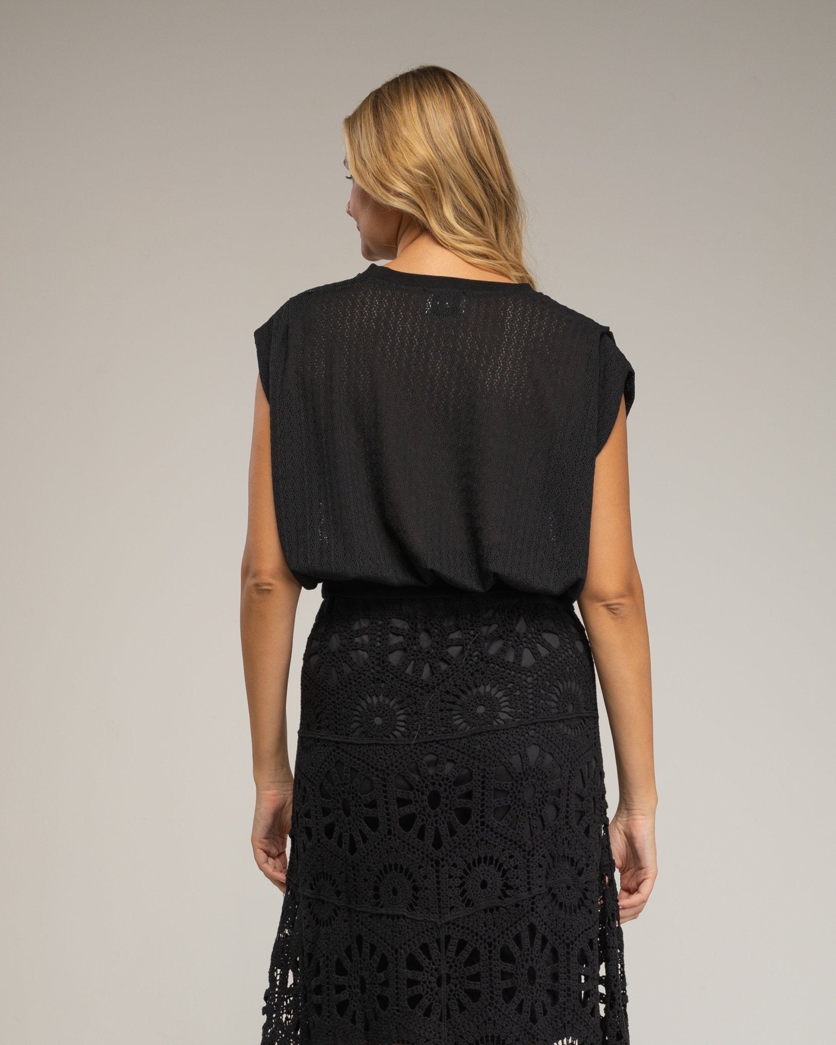 Top de punto calado sin mangas con pliegues en el hombro y elástico en la cintura.
