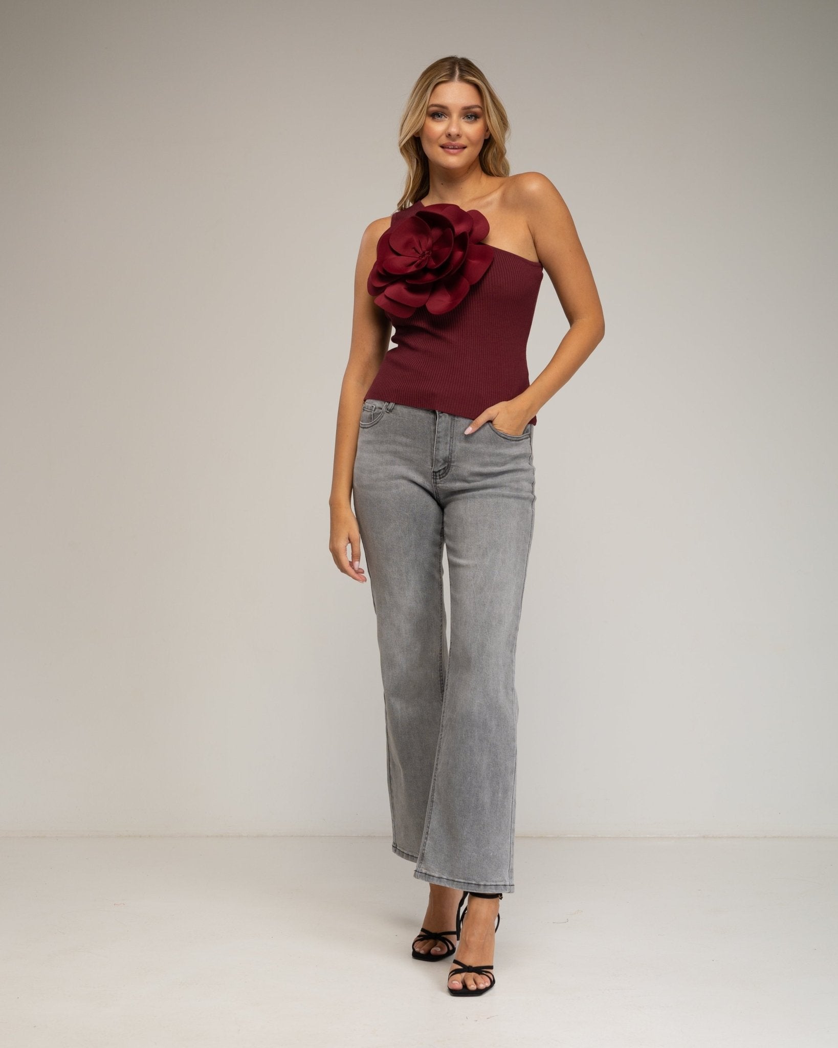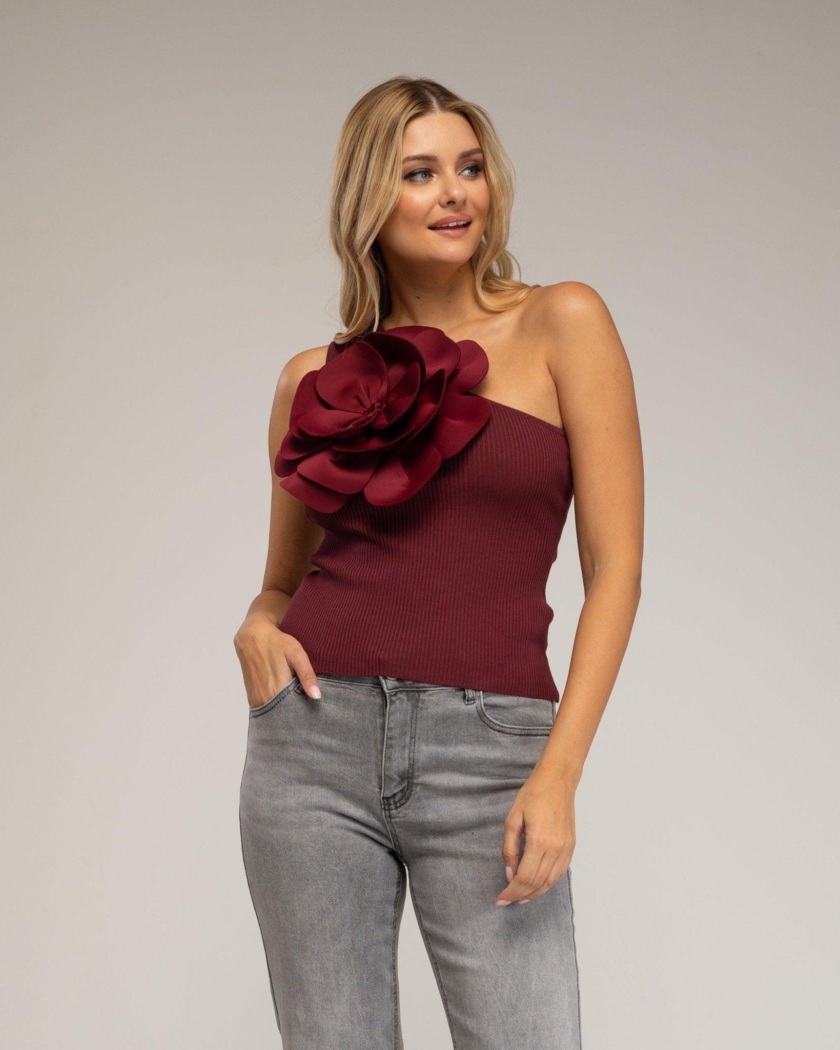 Este top de punto asimétrico destaca por su original diseño de una sola manga y el detalle de una flor en el pecho, que aporta un aire sofisticado y moderno. Su tejido suave y ajuste favorecedor lo hacen ideal para ocasiones especiales o looks con personalidad.
