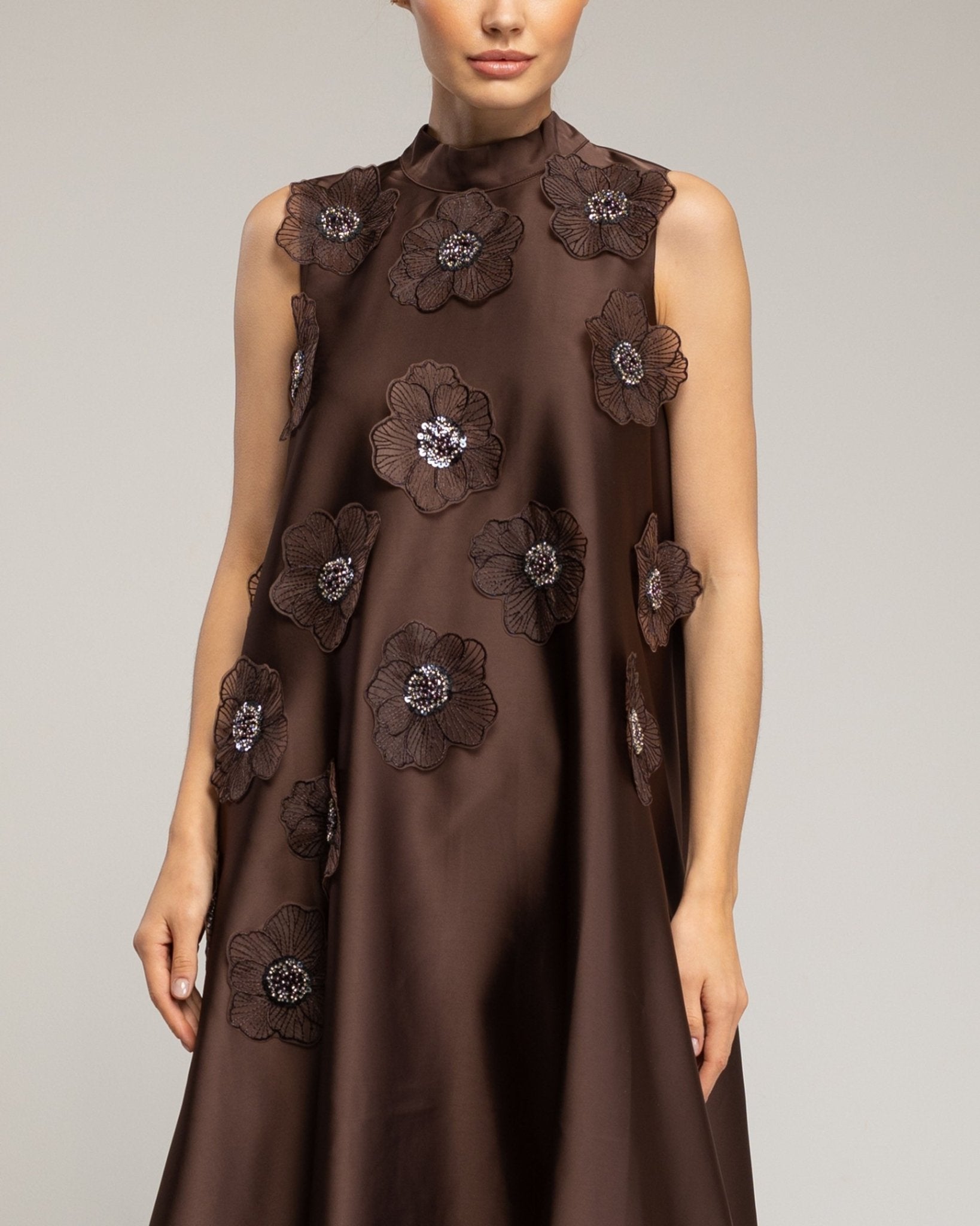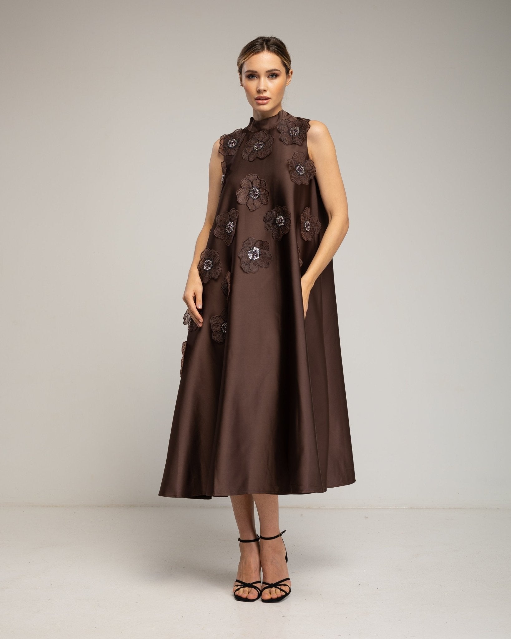 Este vestido amplio tipo A destaca por su diseño femenino y delicado. Las flores cosidas con strass aportan un toque elegante y luminoso, mientras que el cierre con cremallera y el lazo en la cintura permiten un ajuste cómodo y favorecedor. Ideal para eventos especiales o looks sofisticados de día y noche.