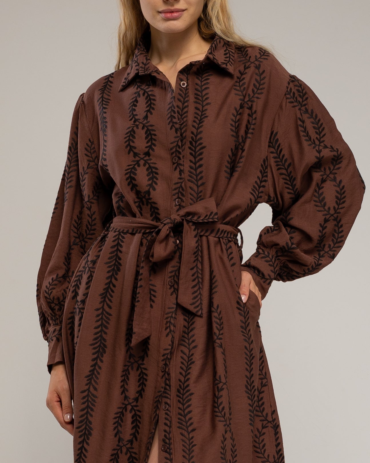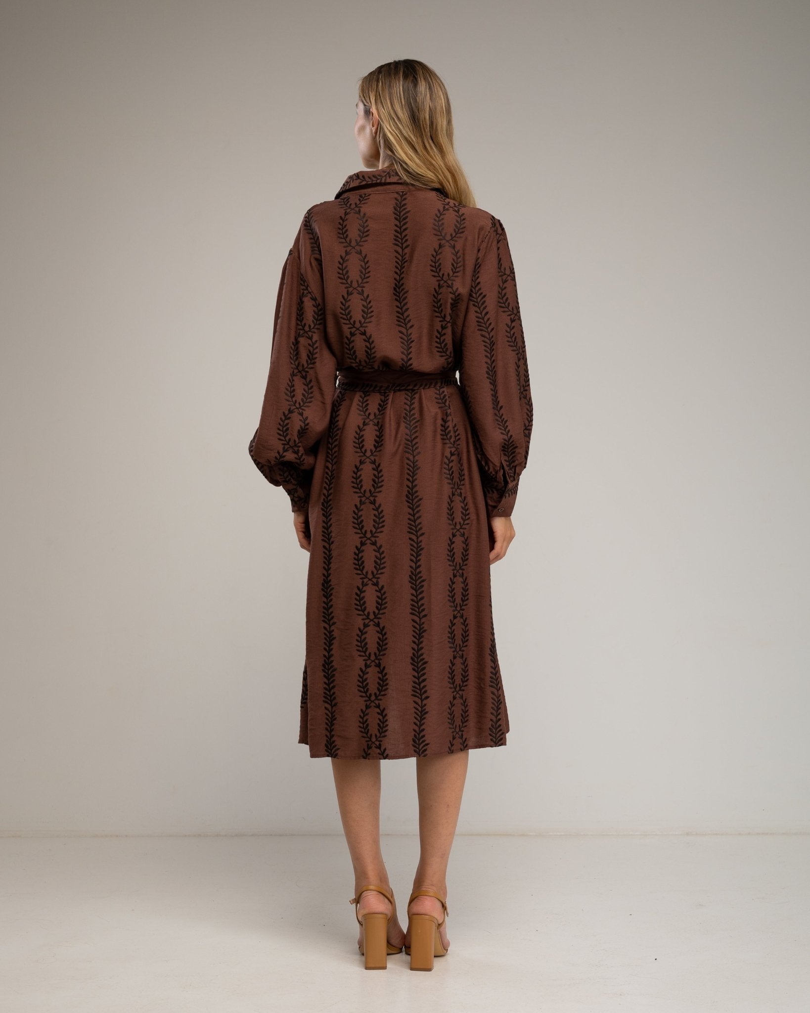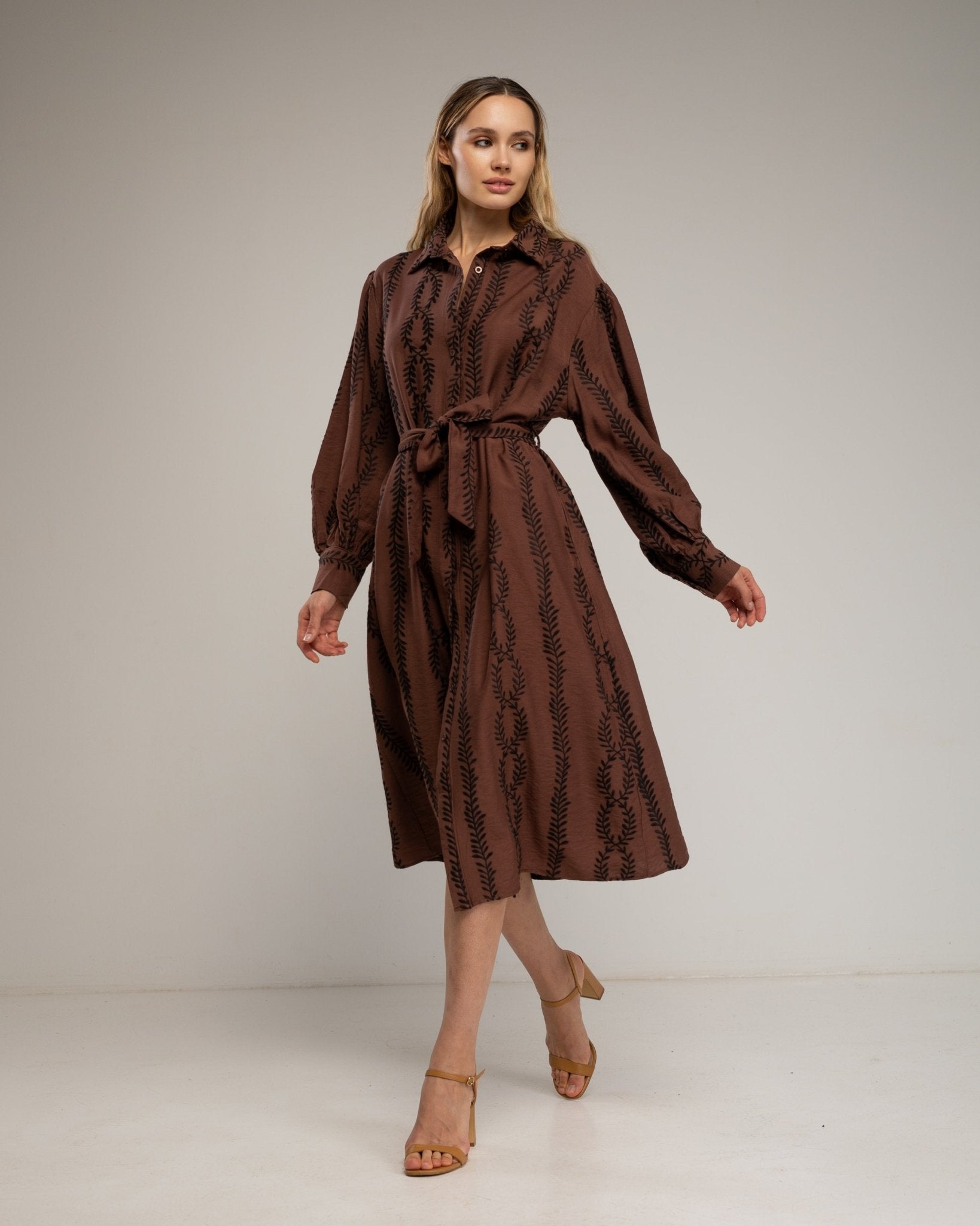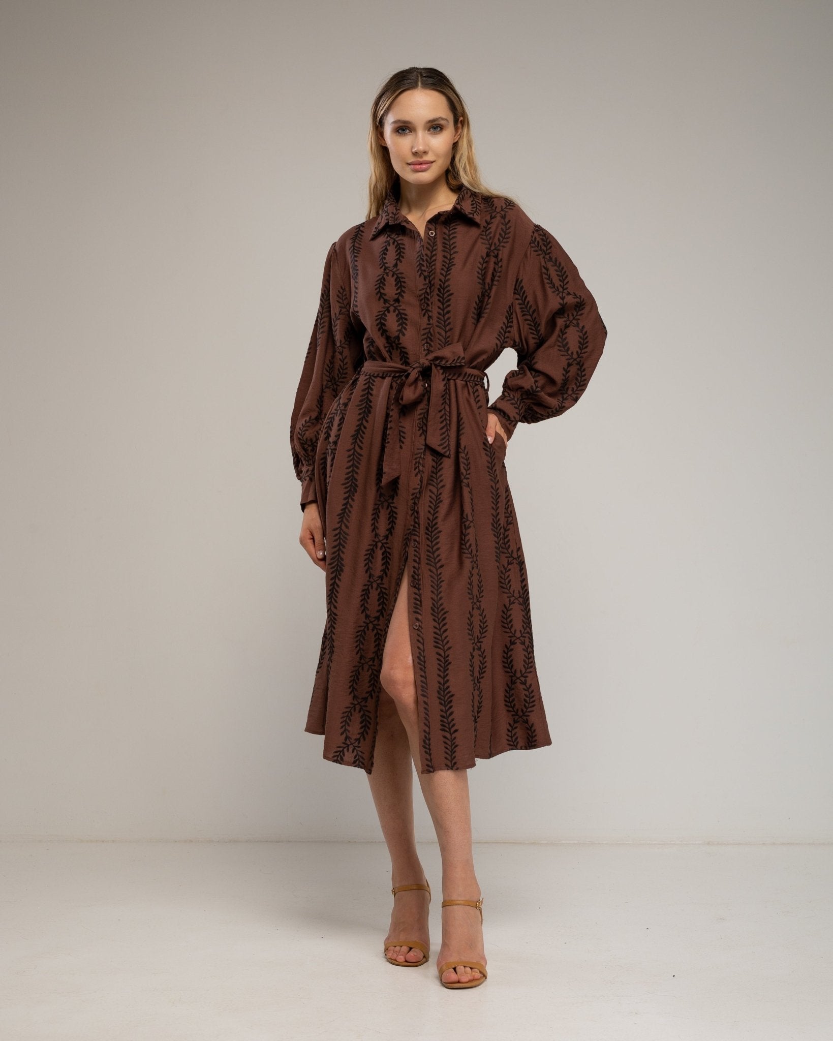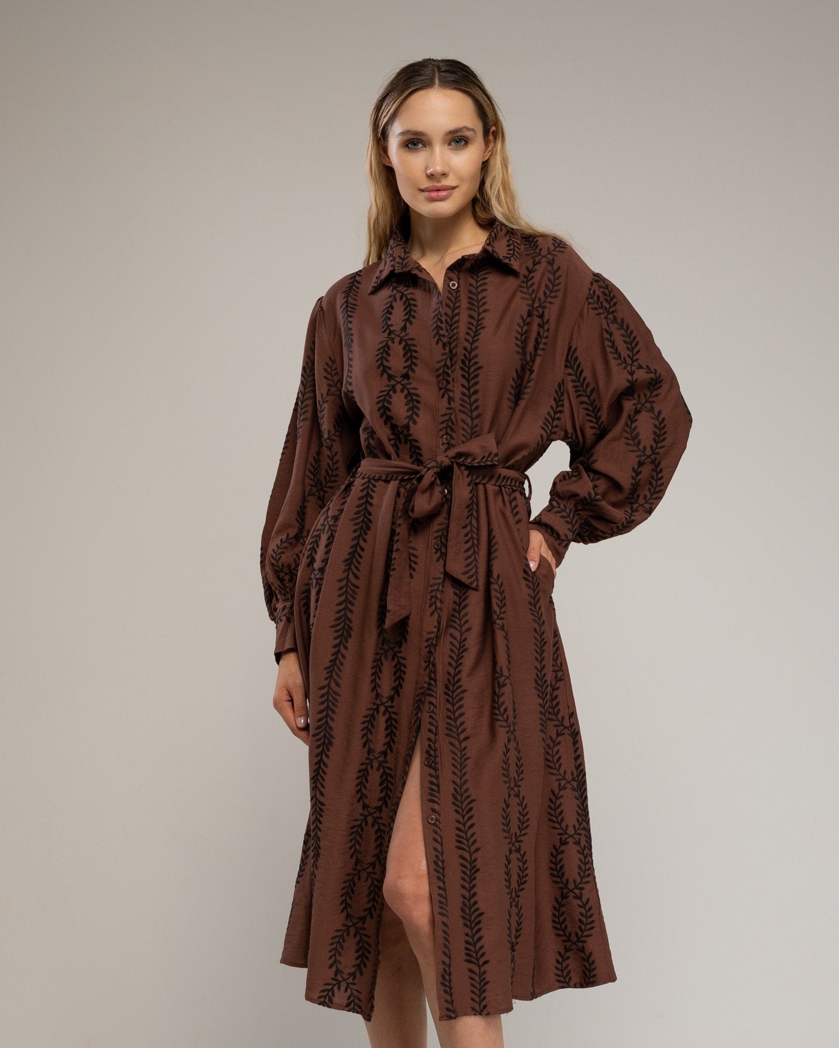 Vestido camisero con cinturon y con bordados en todo el tejido.