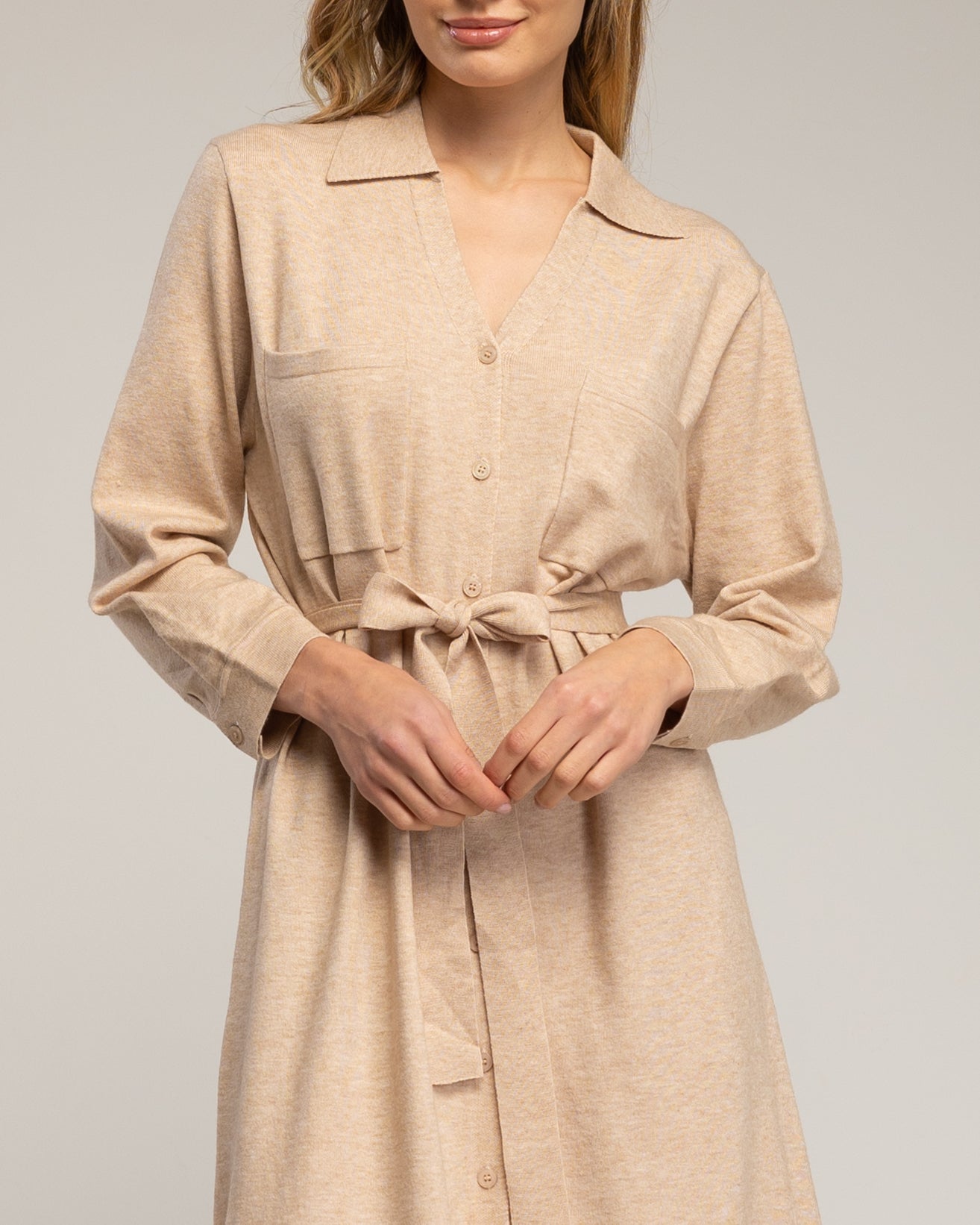 Vestido camisero de punto largo con bolsillos en el pecho y cinturon. (BEIGE)