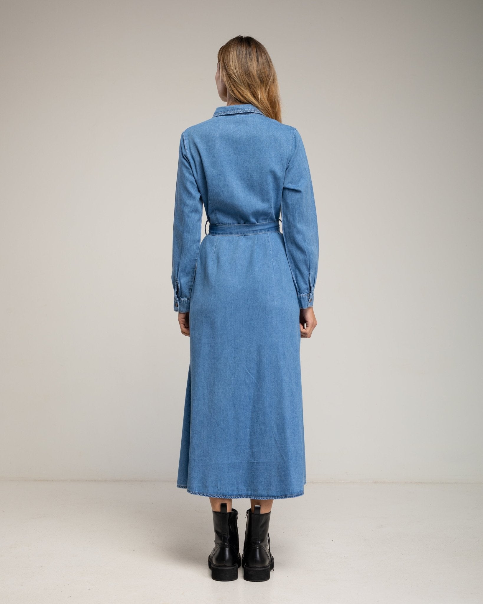 Vestido camisero midi con bolsillos en el pecho, falda de vuelo y cinturon. (LIGHTDENIM)