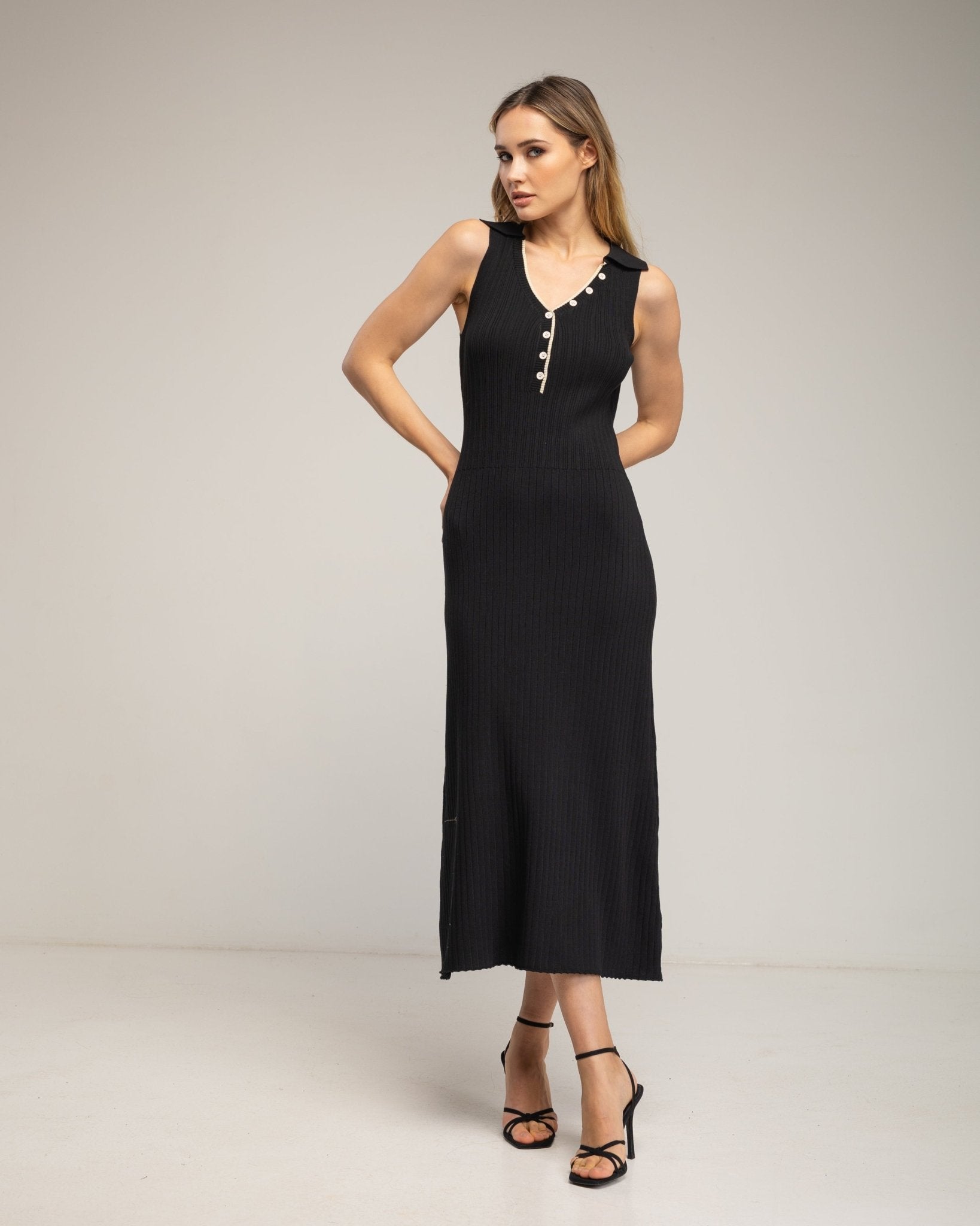 Vestido de punto largo plisado sin mangas con botones (NEGRO)
