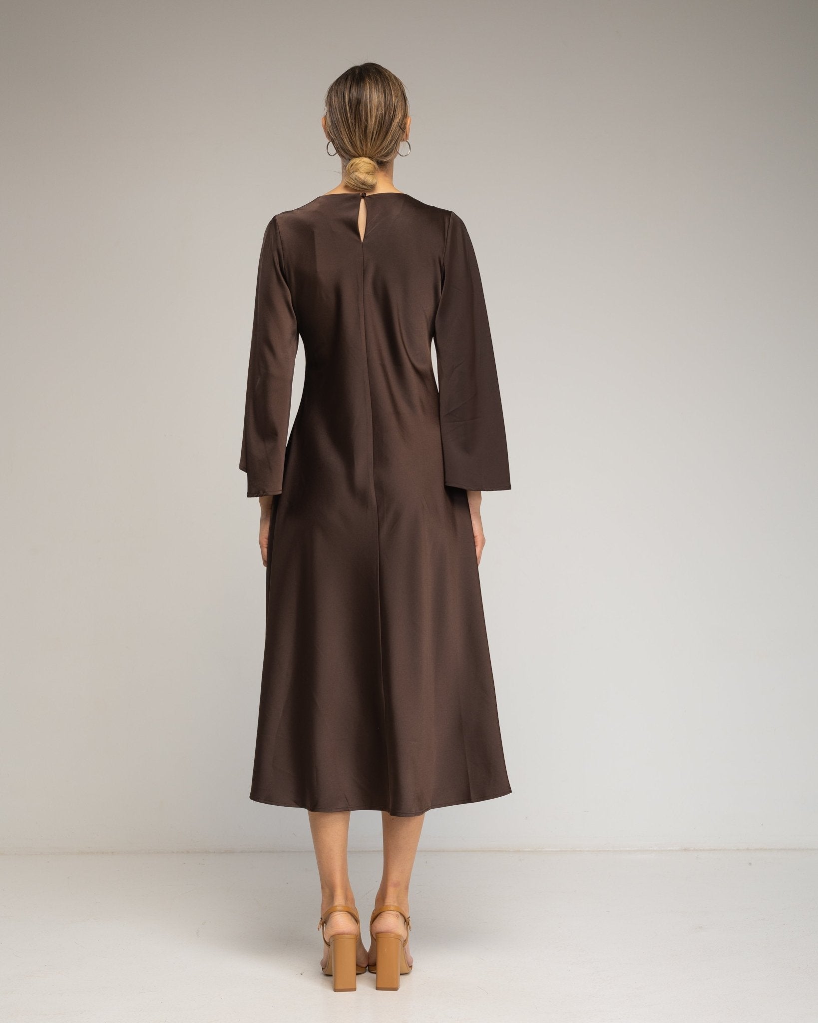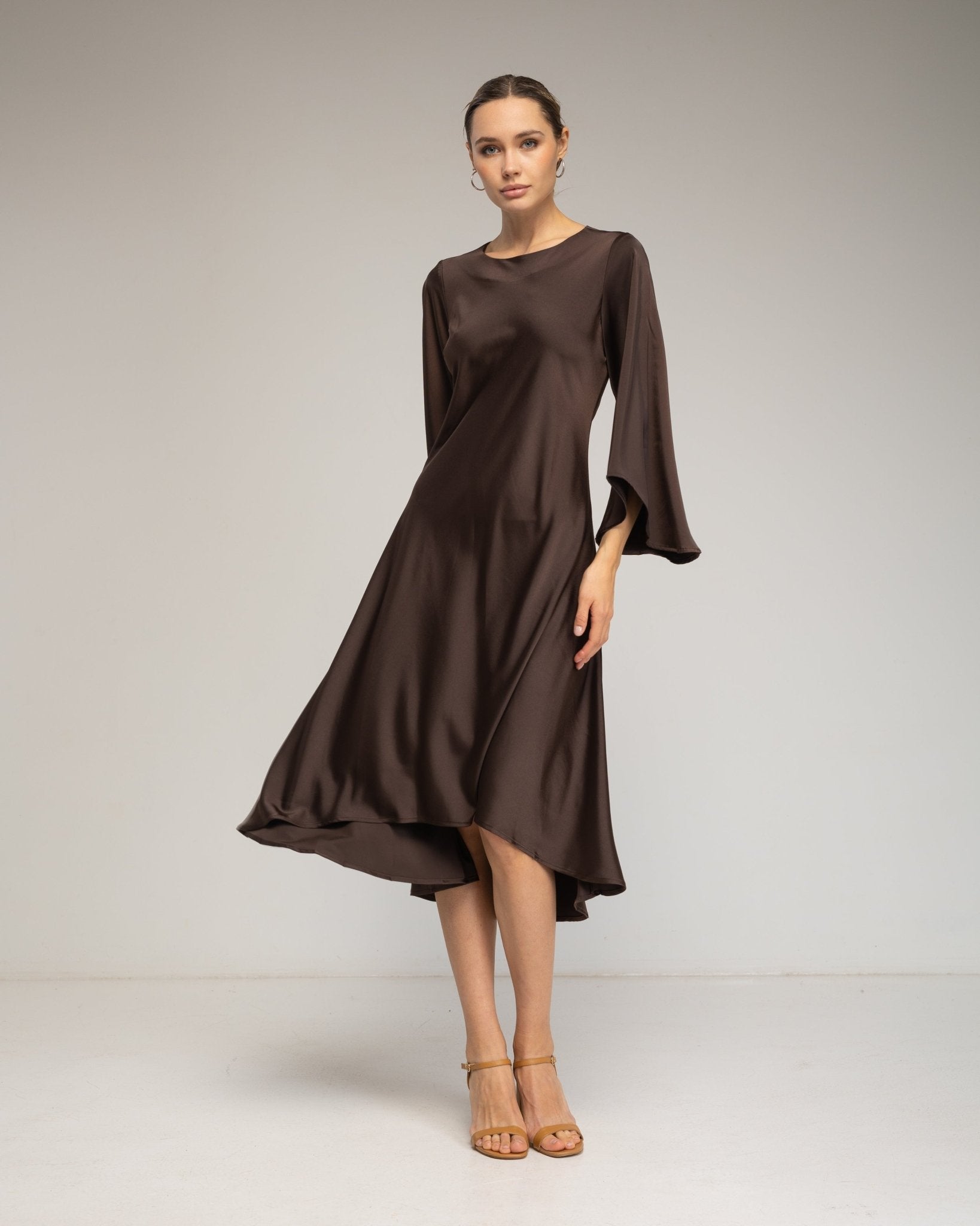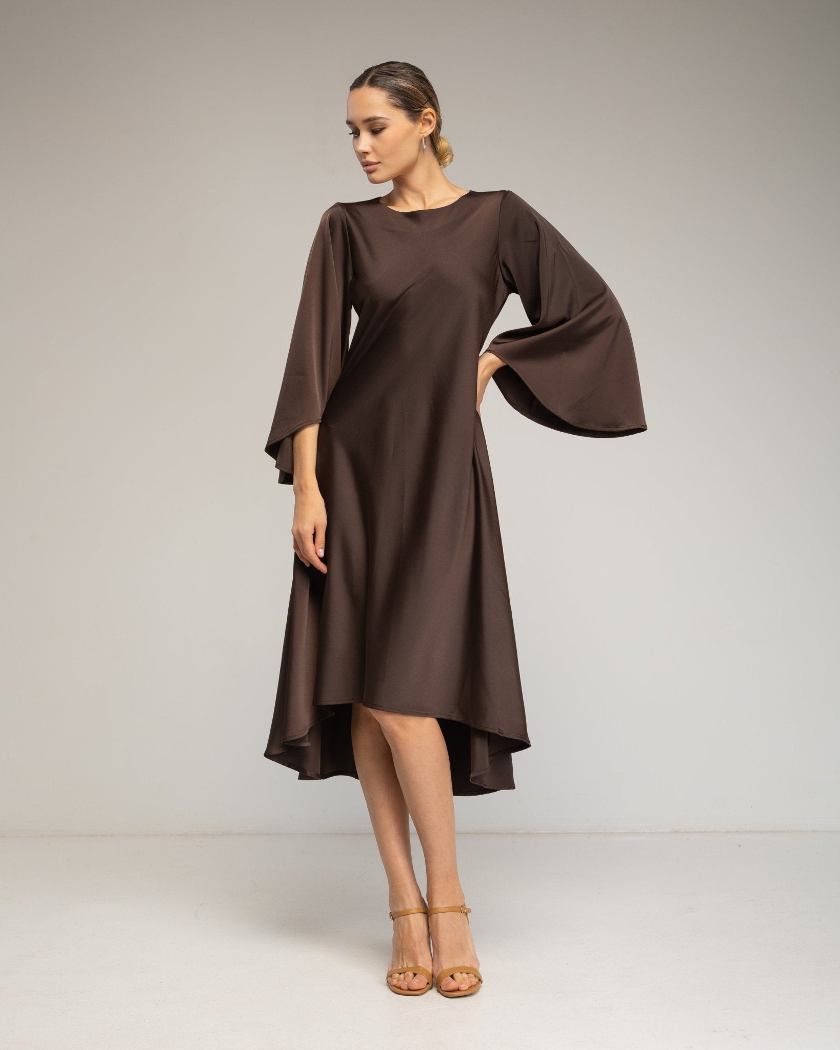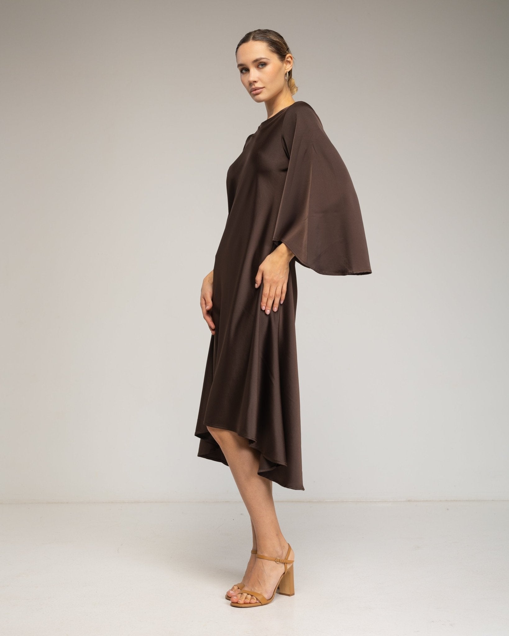Este vestido midi de raso aporta un look elegante y fluido, con un brillo sutil que eleva cualquier ocasión. El cuello redondo y las mangas amplias crean una silueta equilibrada, mientras que el bajo asimétrico y el vuelo añaden movimiento y un toque diferencial. Ideal para eventos donde se busca sofisticación sin excesos.