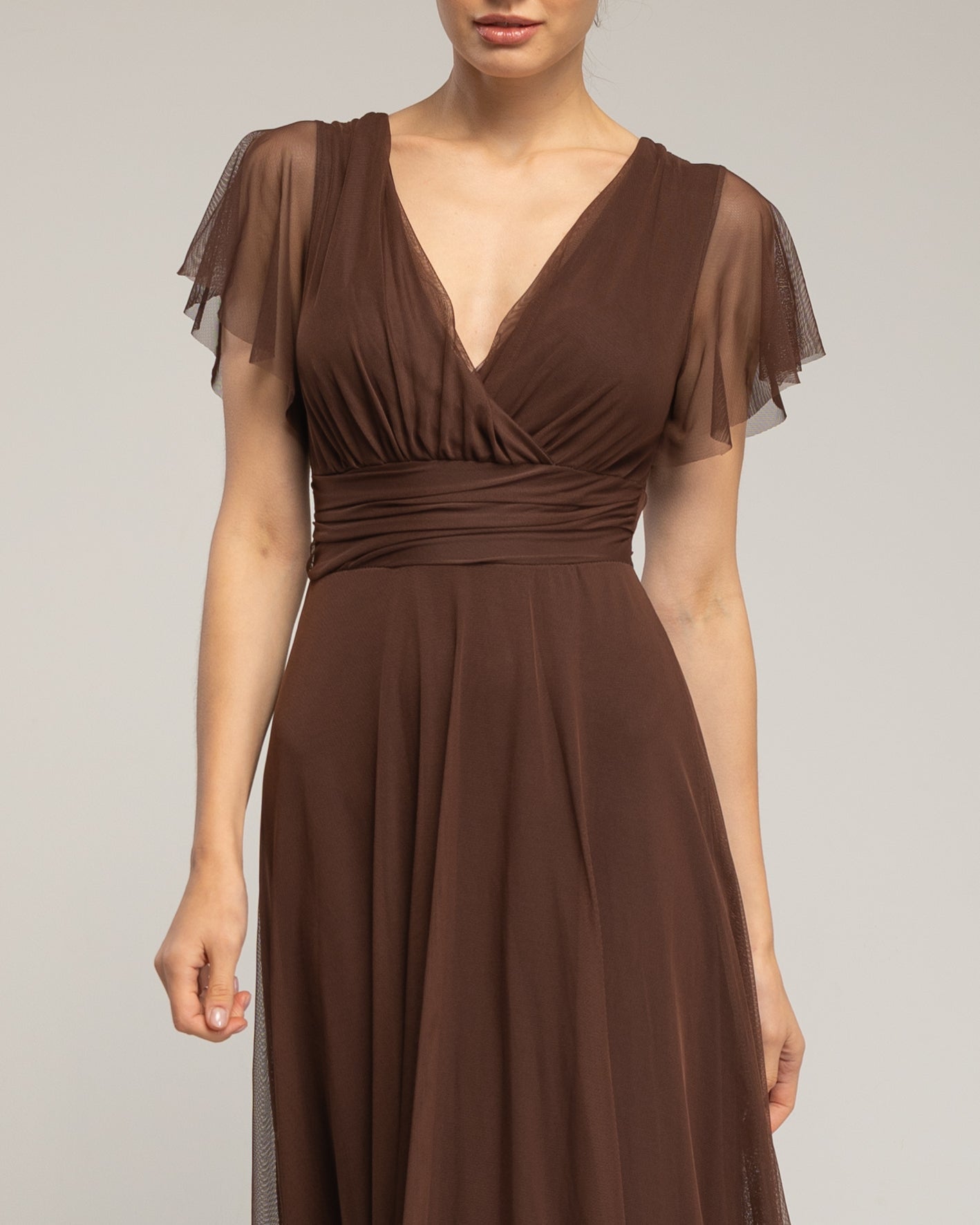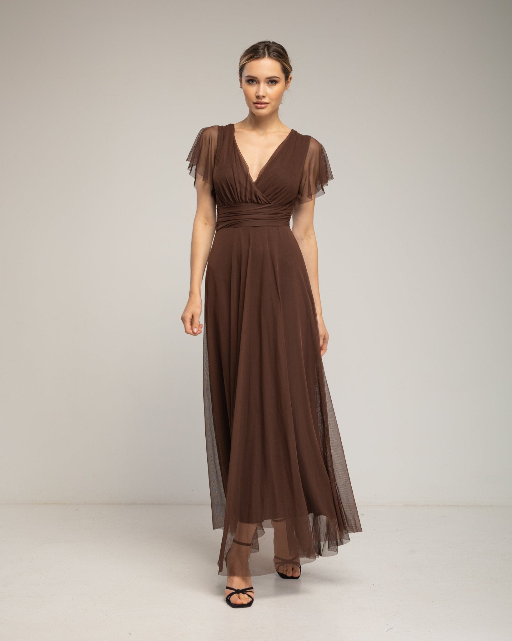 Vestido de tul largo con un pequeña manga, pligue y falda de vuelo , con tira para atar. (BROWN)