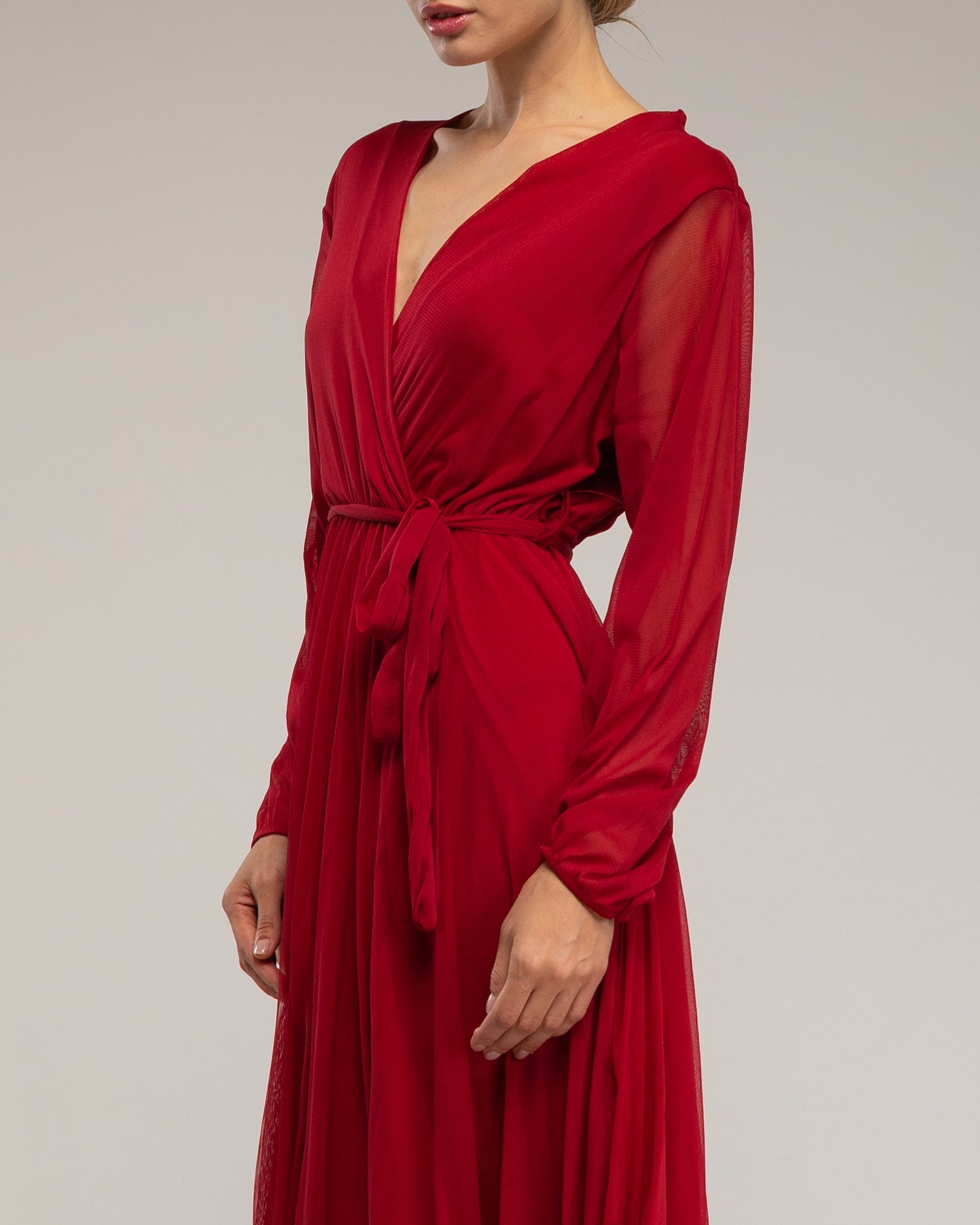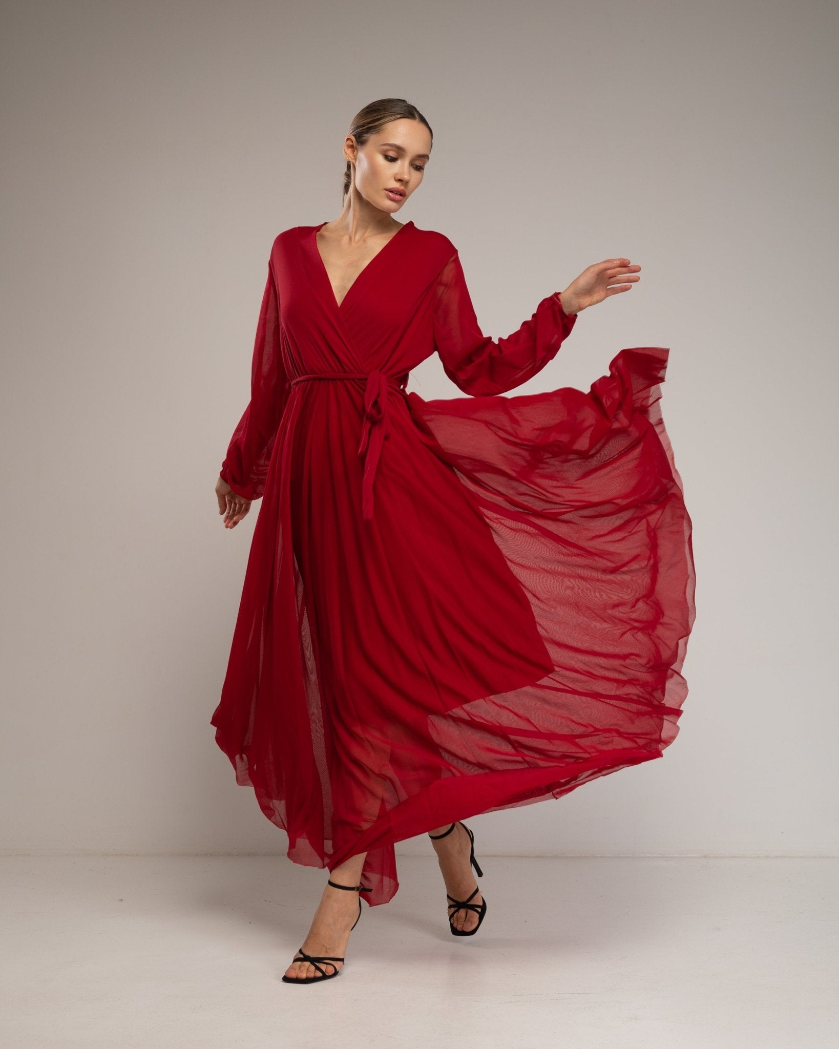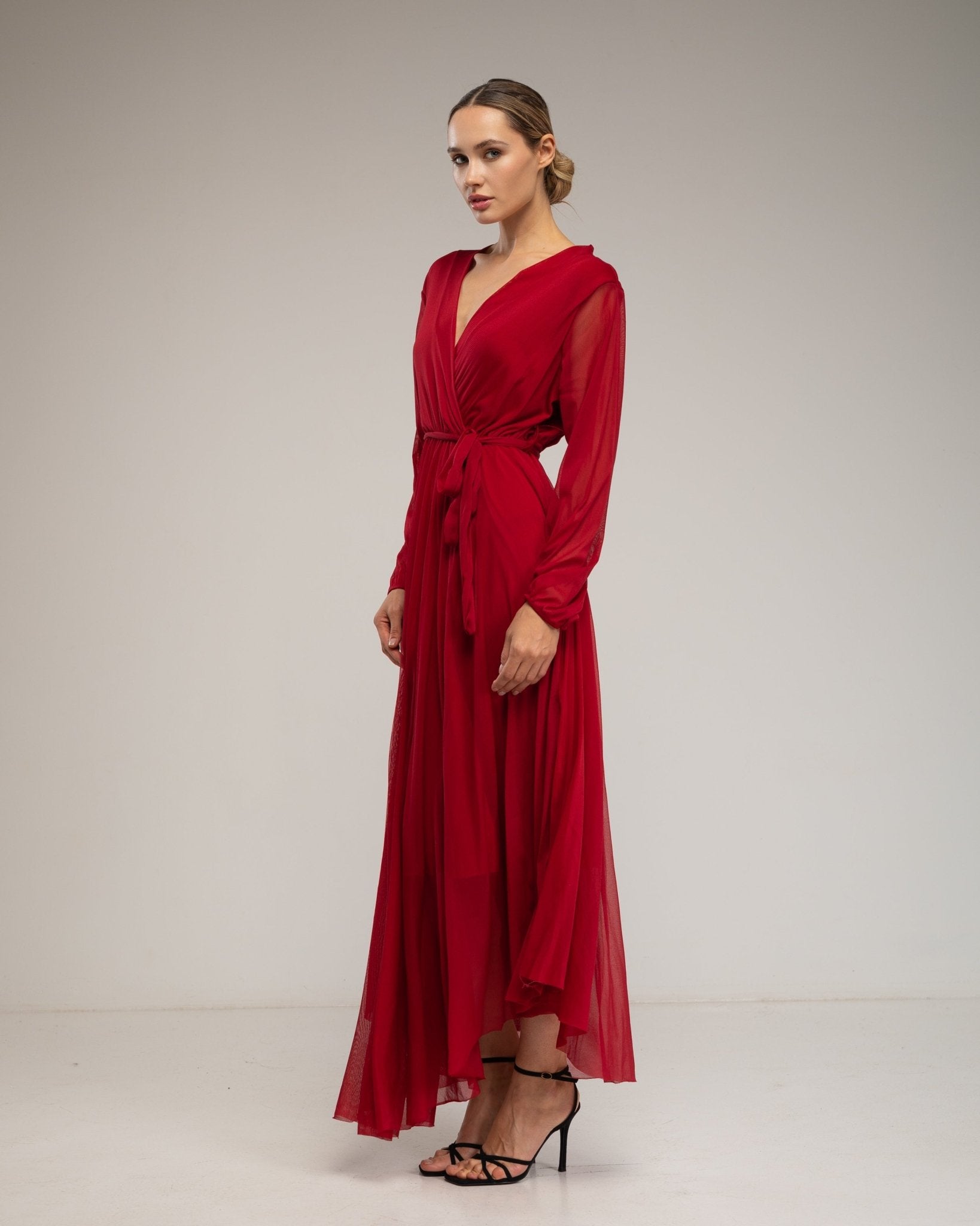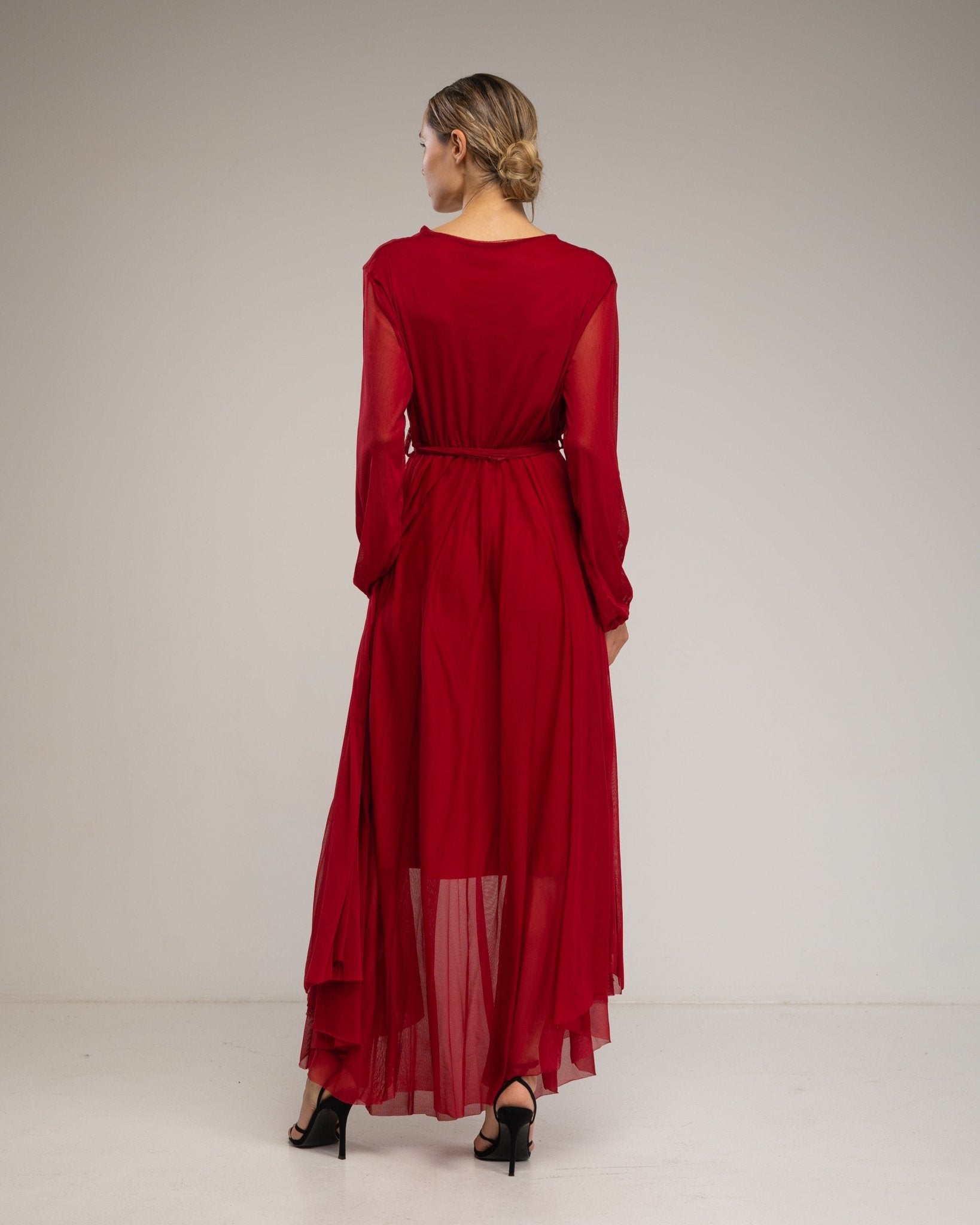 Este vestido largo de tul en capas aporta un look etéreo y sofisticado. El cuello pico realza la silueta, mientras que las capas de tul generan movimiento y un acabado elegante ideal para ocasiones especiales. El forro de viscosa asegura comodidad y una caída impecable.
