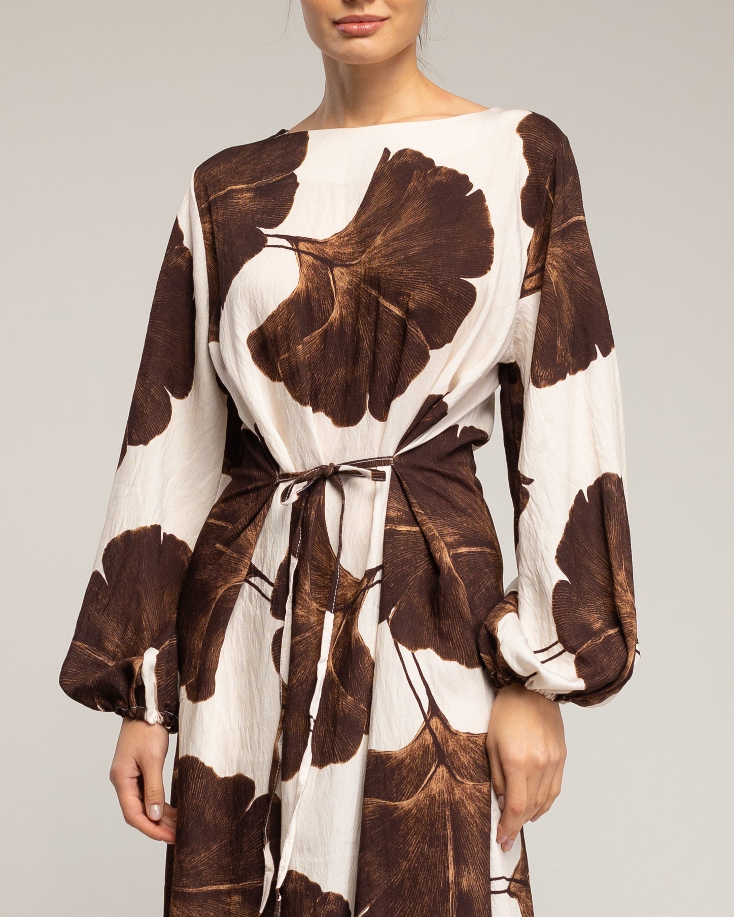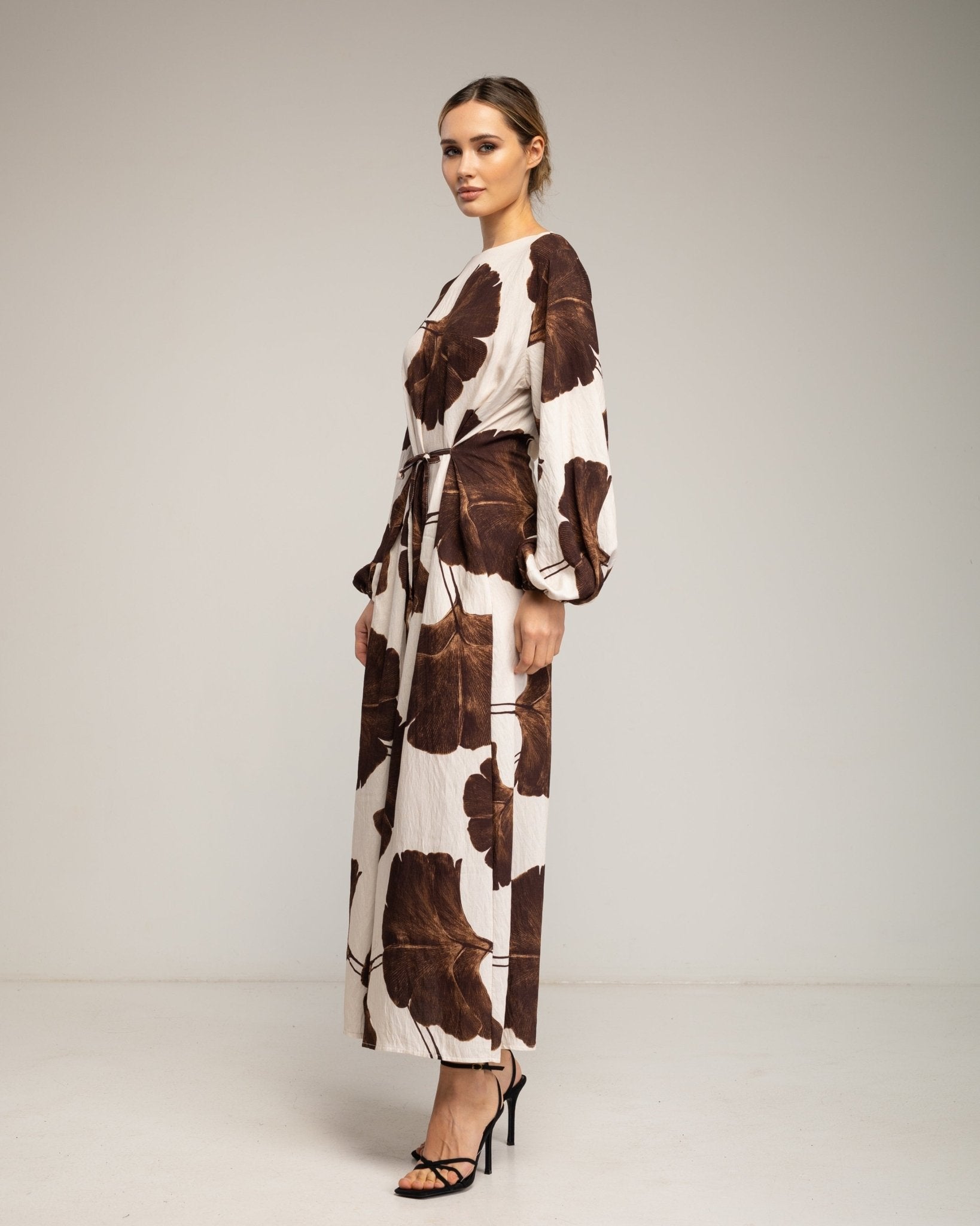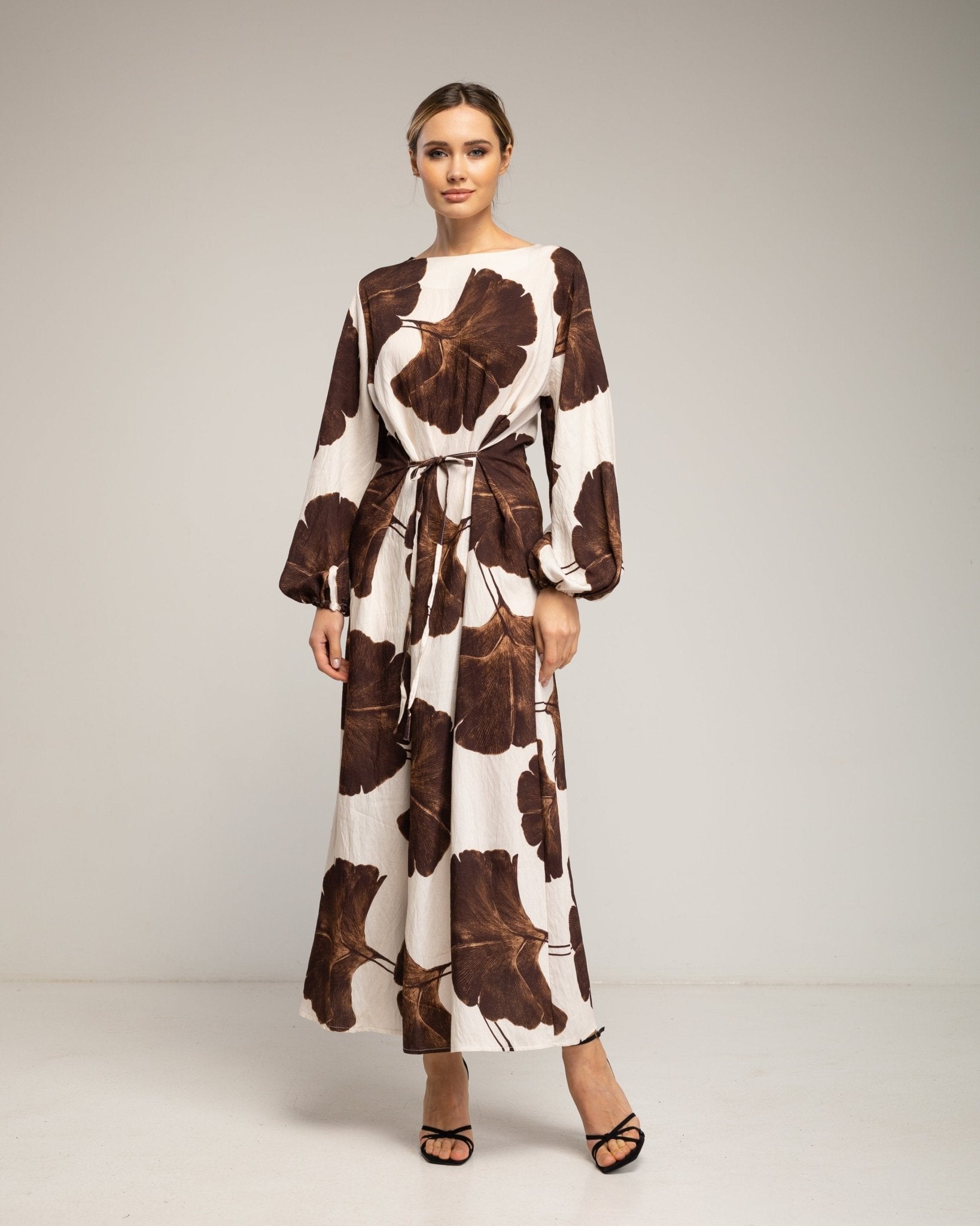 Vestido largo de flores con cuello cuadrado y tiras atrás. (MARRON)