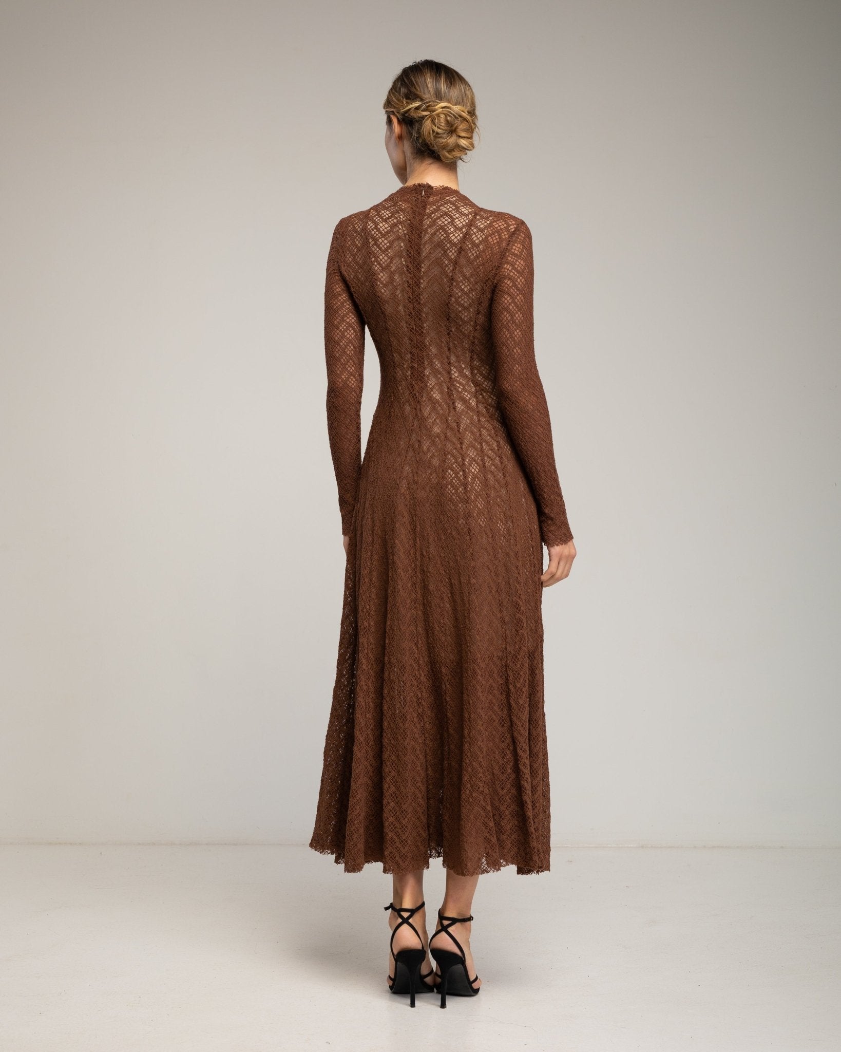 Vestido largo de manga larga de encaje con textura, falda de vuelo con pinzas (BROWN)
