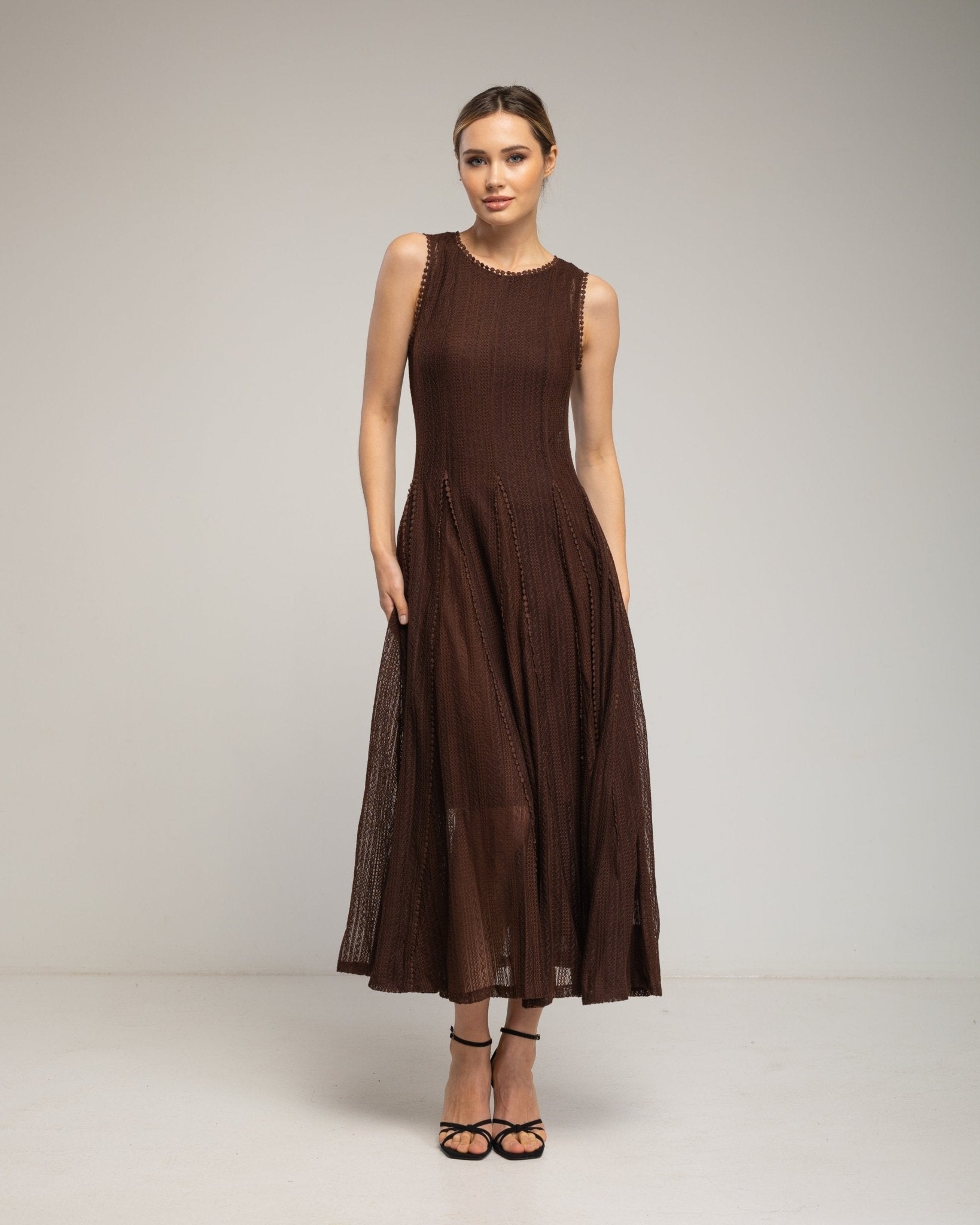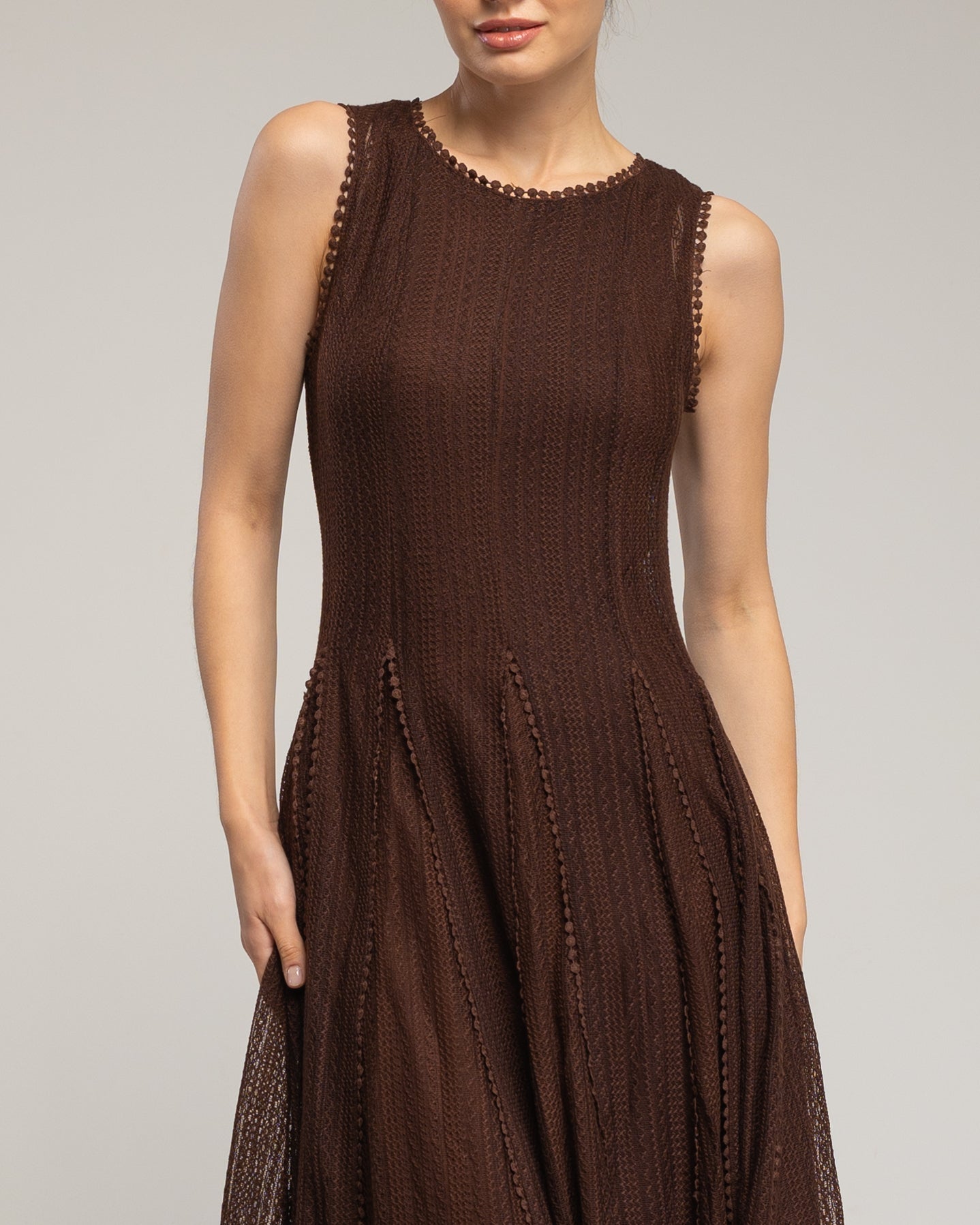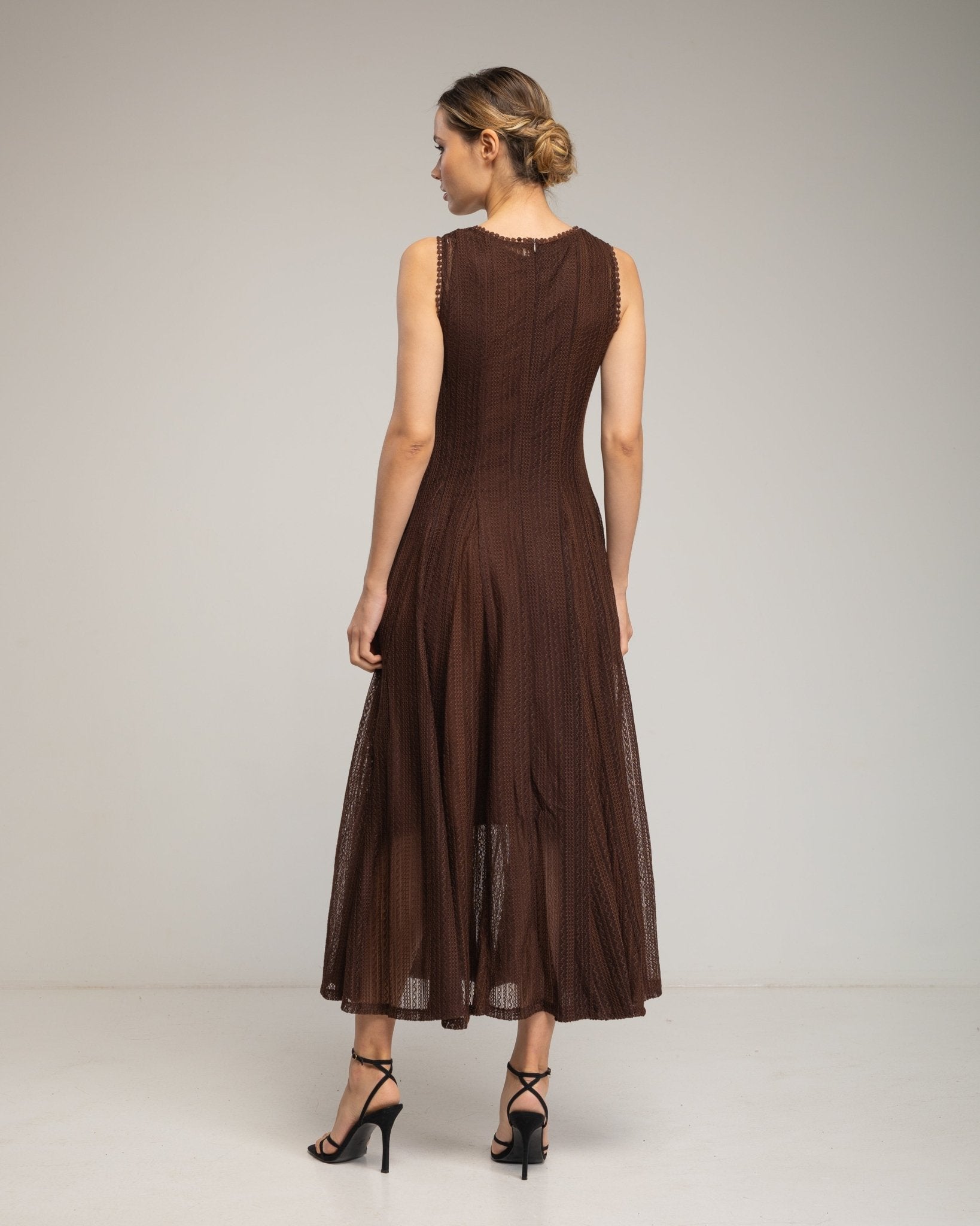 Vestido largo sin mangas de encaje con textura, falda de vuelo con pinzas. (BROWN)