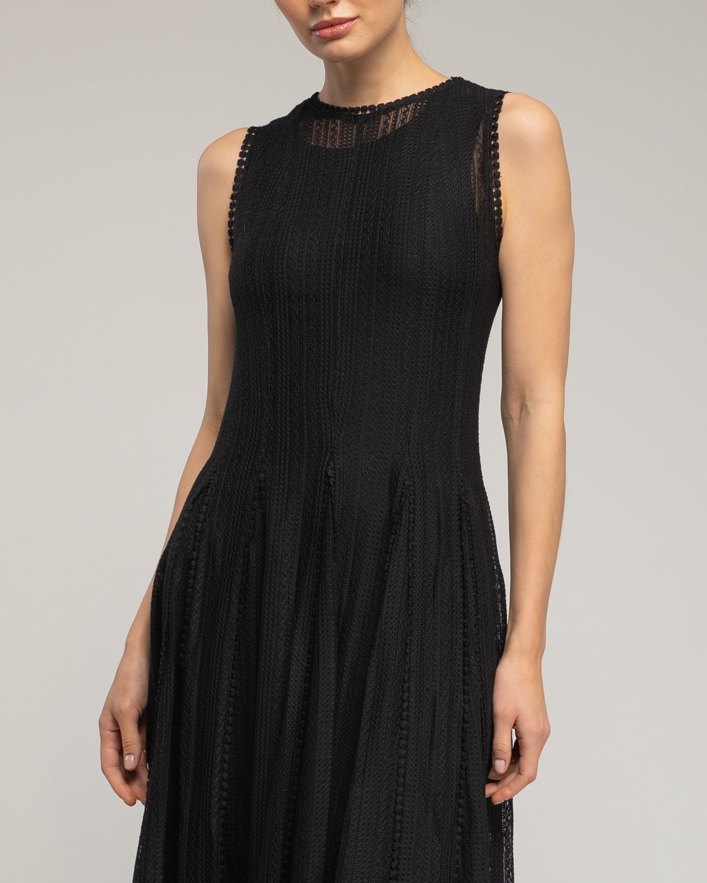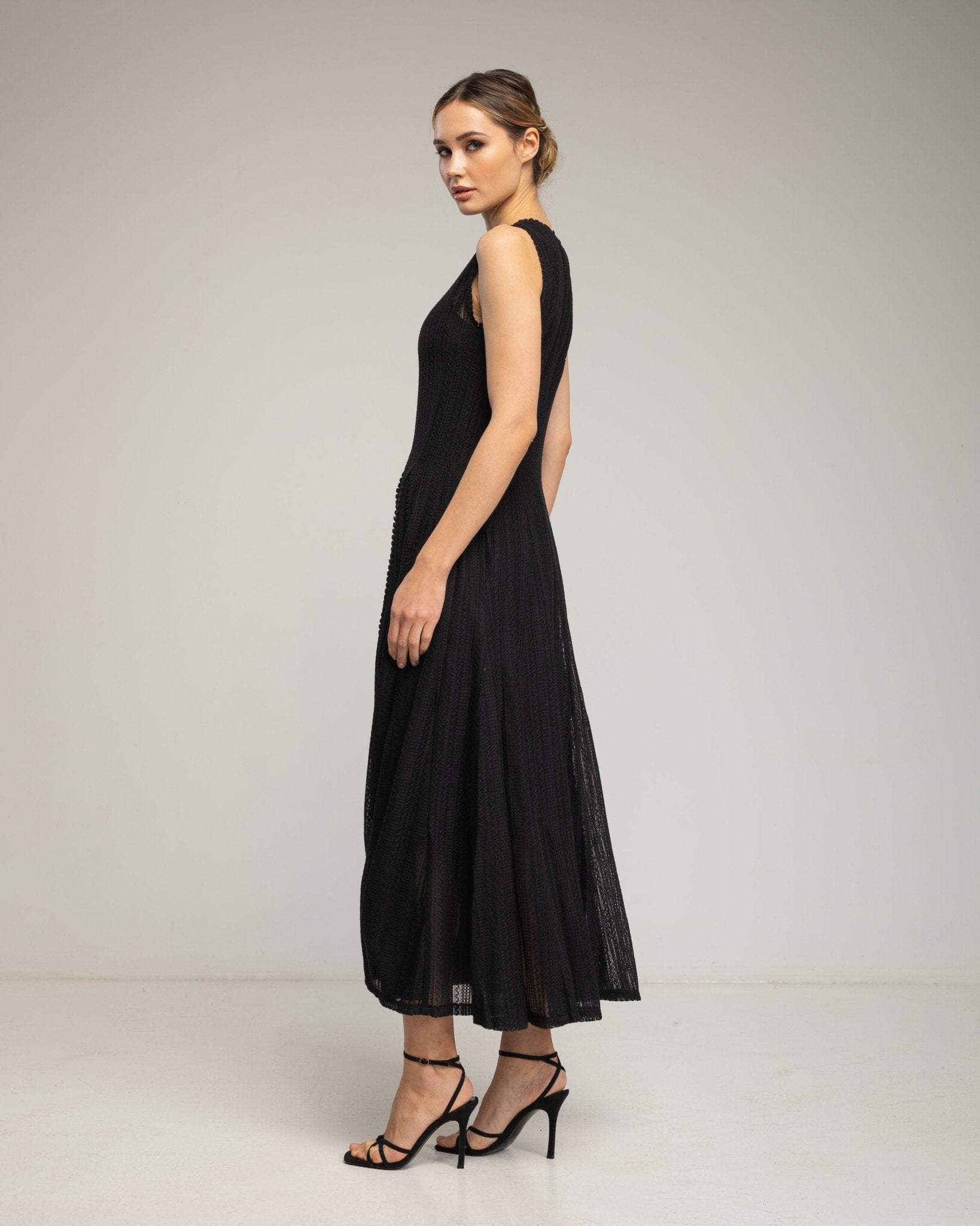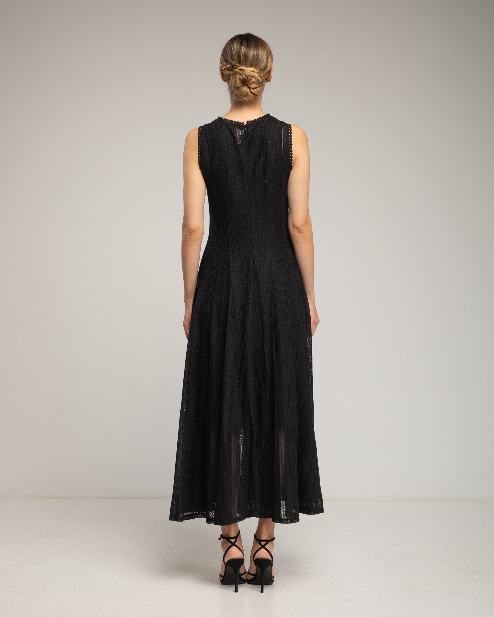 Vestido largo sin mangas de encaje con textura, falda de vuelo con pinzas. (NEGRO)