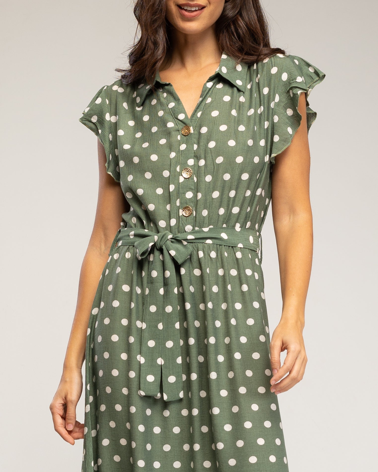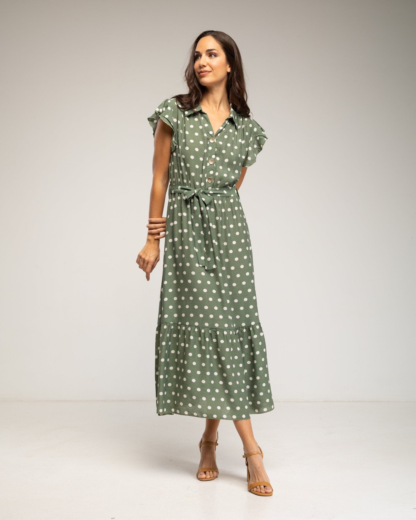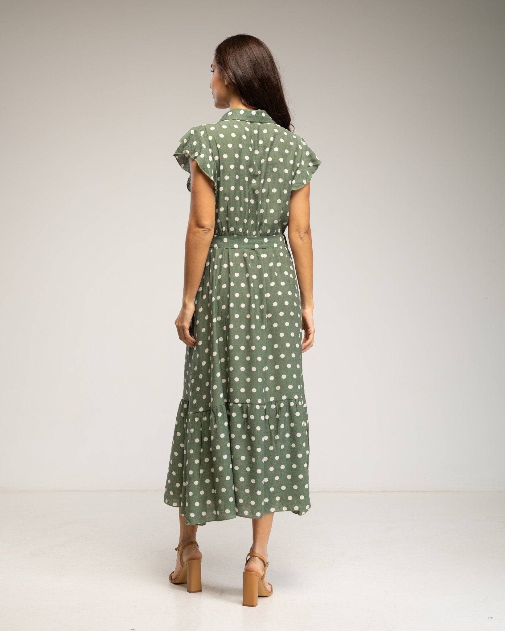 Vestido midi de lunares con botones en la parte de arriba, falda de vuelo y cinturón (KAKHI)