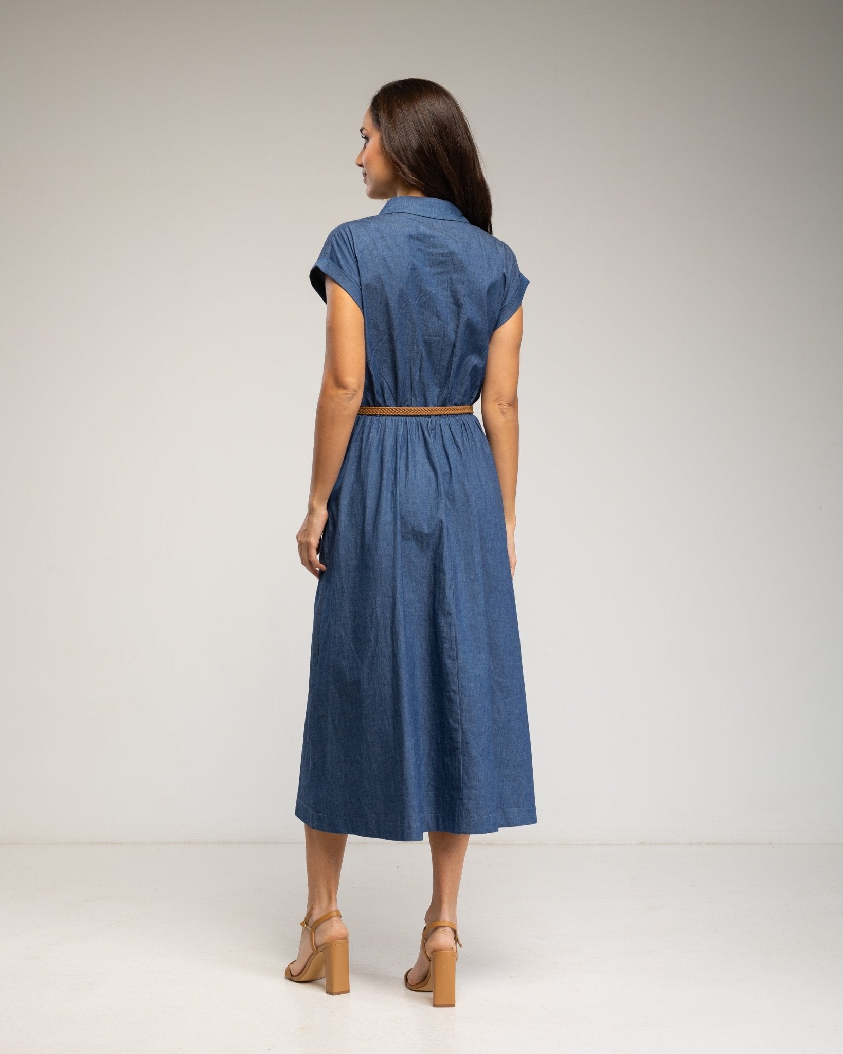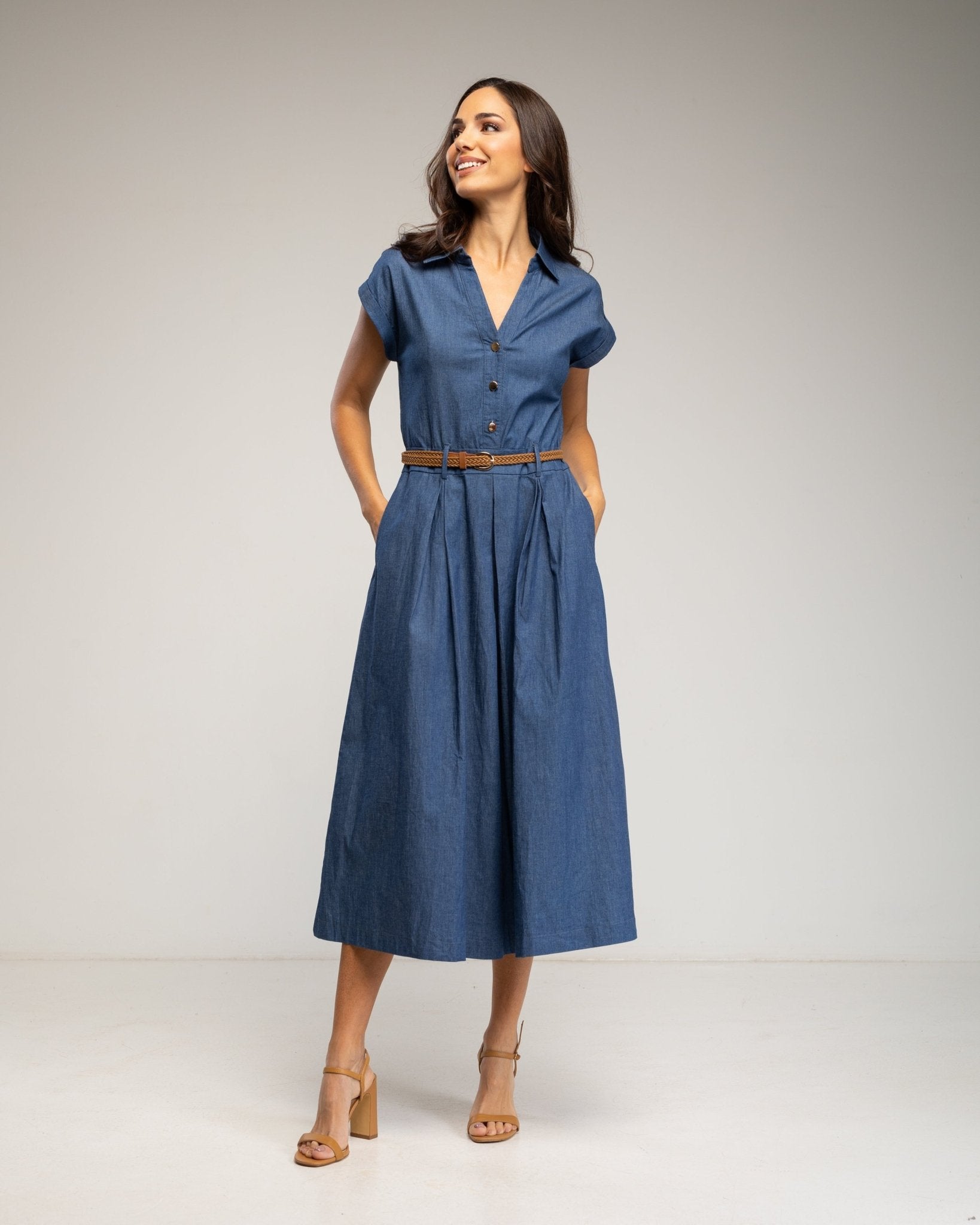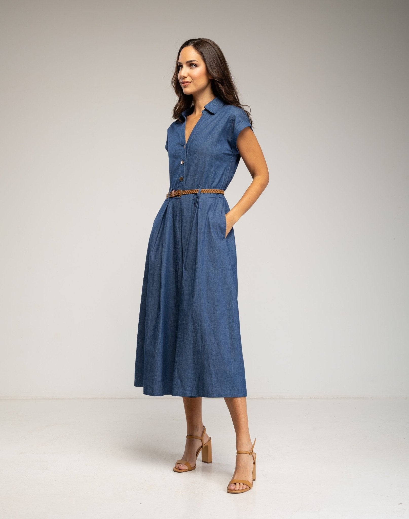 Vestido midi denim con cuerpo abotonado y falda de vuelo con bolsillos (LIGHTDENIM)