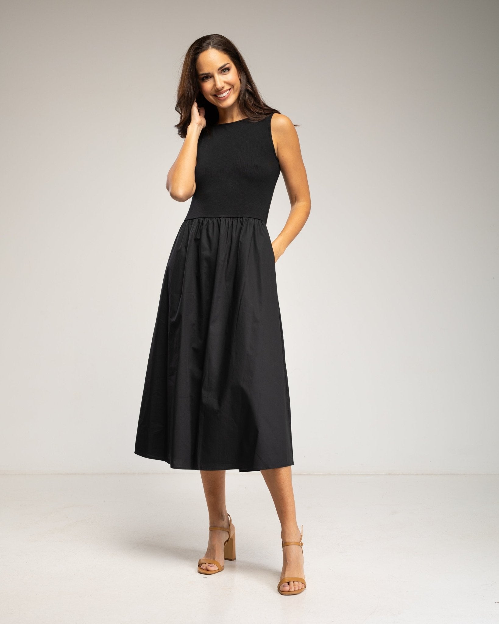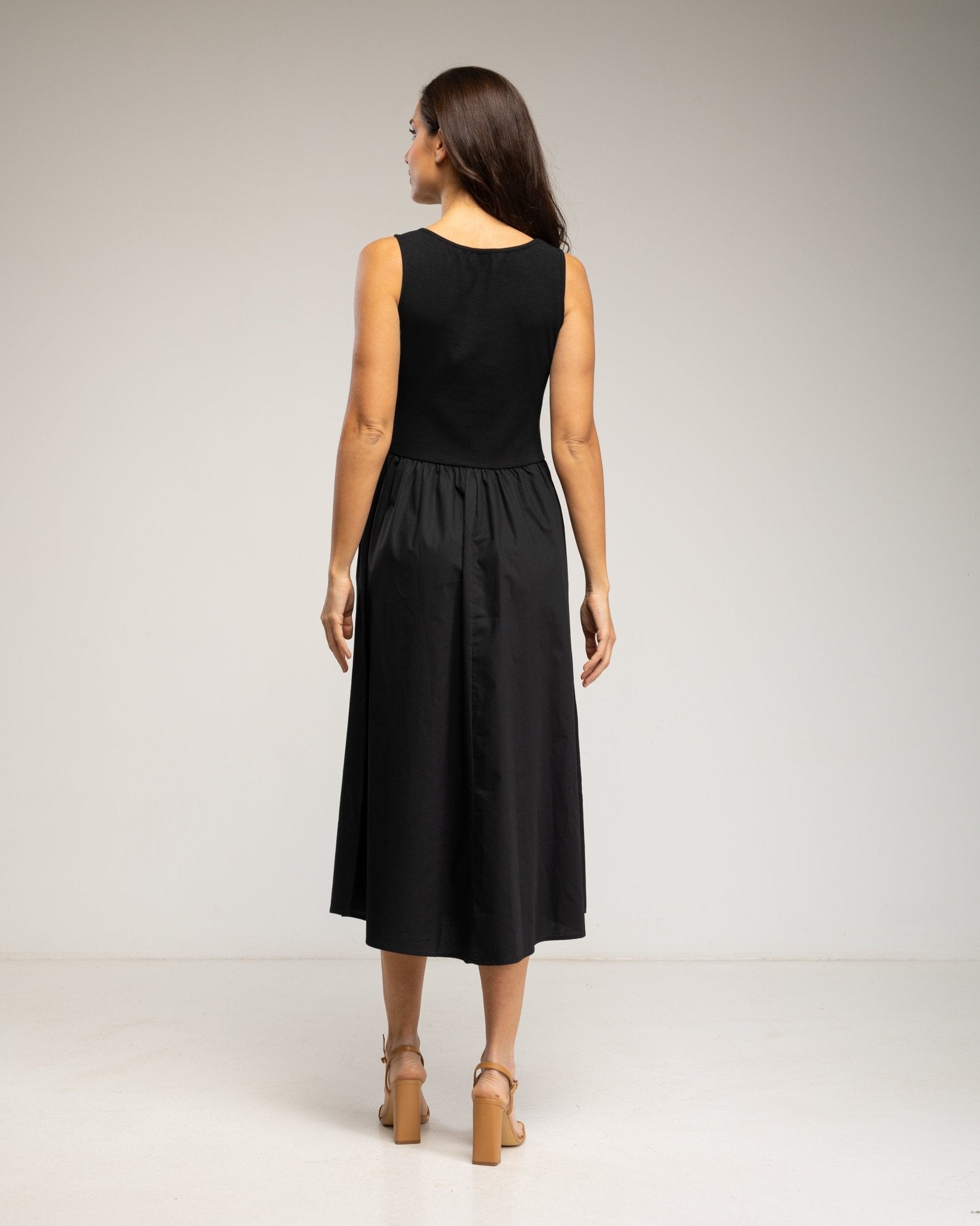 Vestido midi sin mangas con parte de arriba tipo camiseta y falda de vuelo con bolsillos (BLACK))) (Copia) (Copia) (Copia)