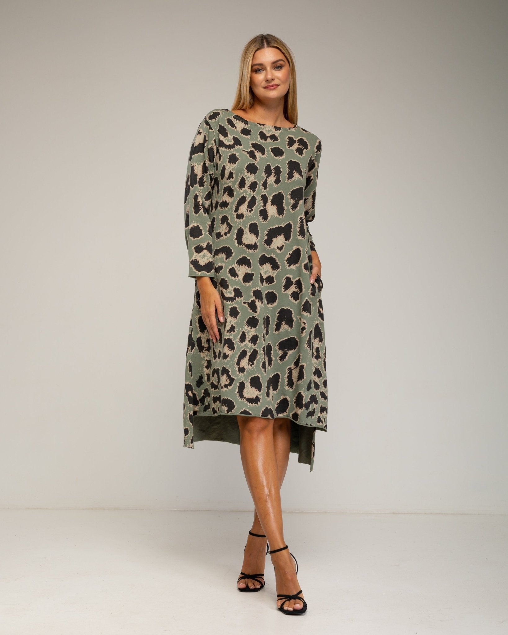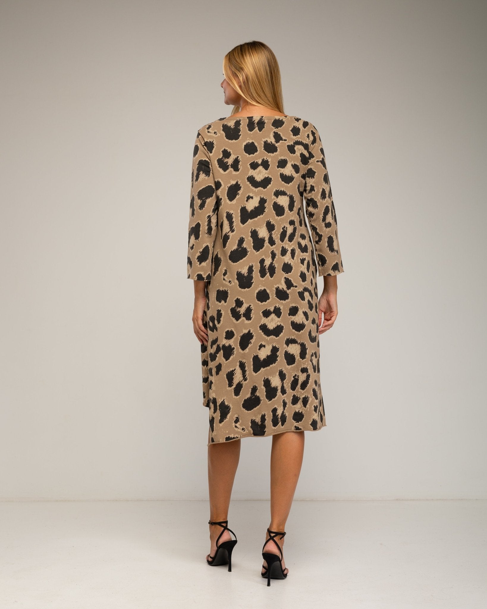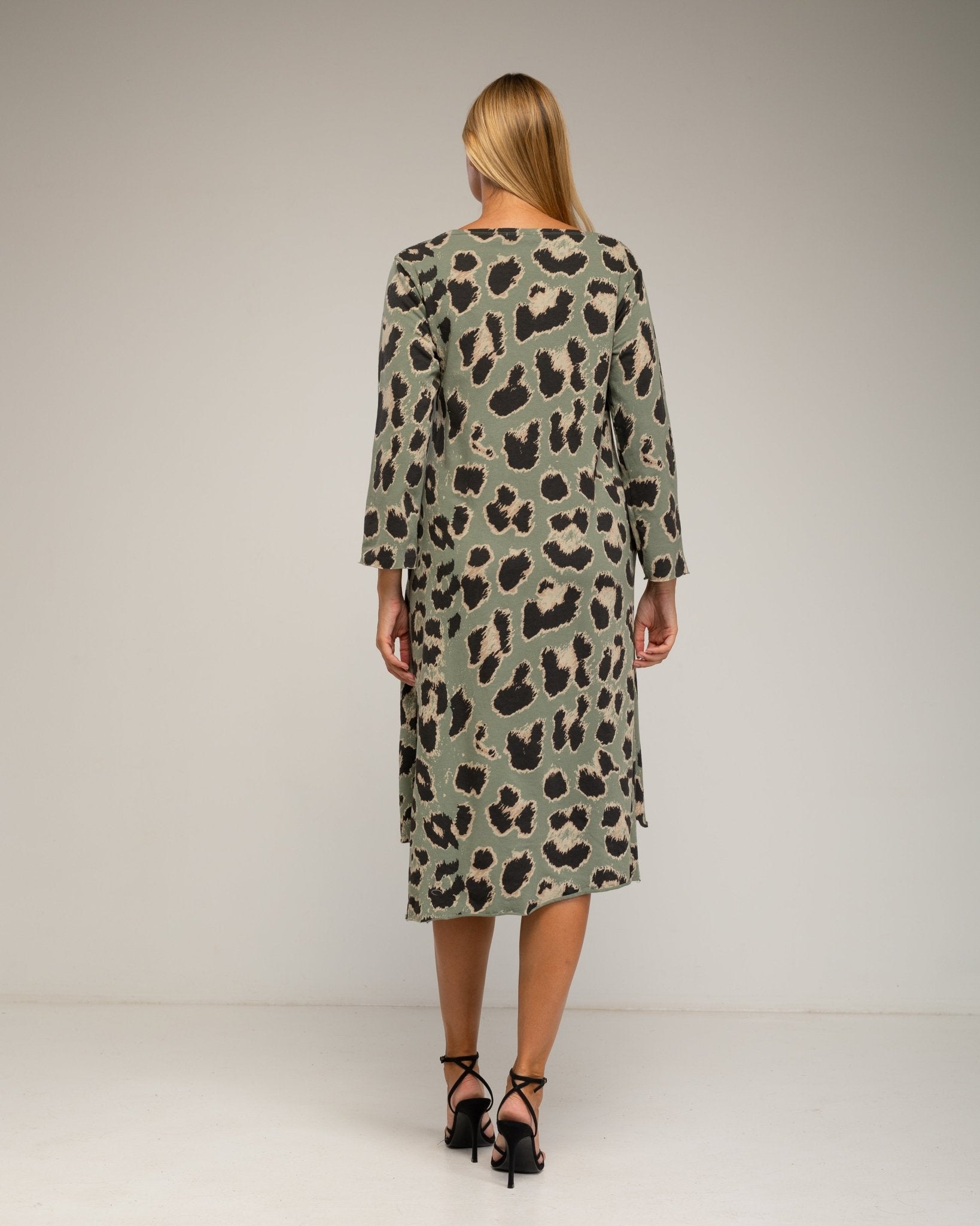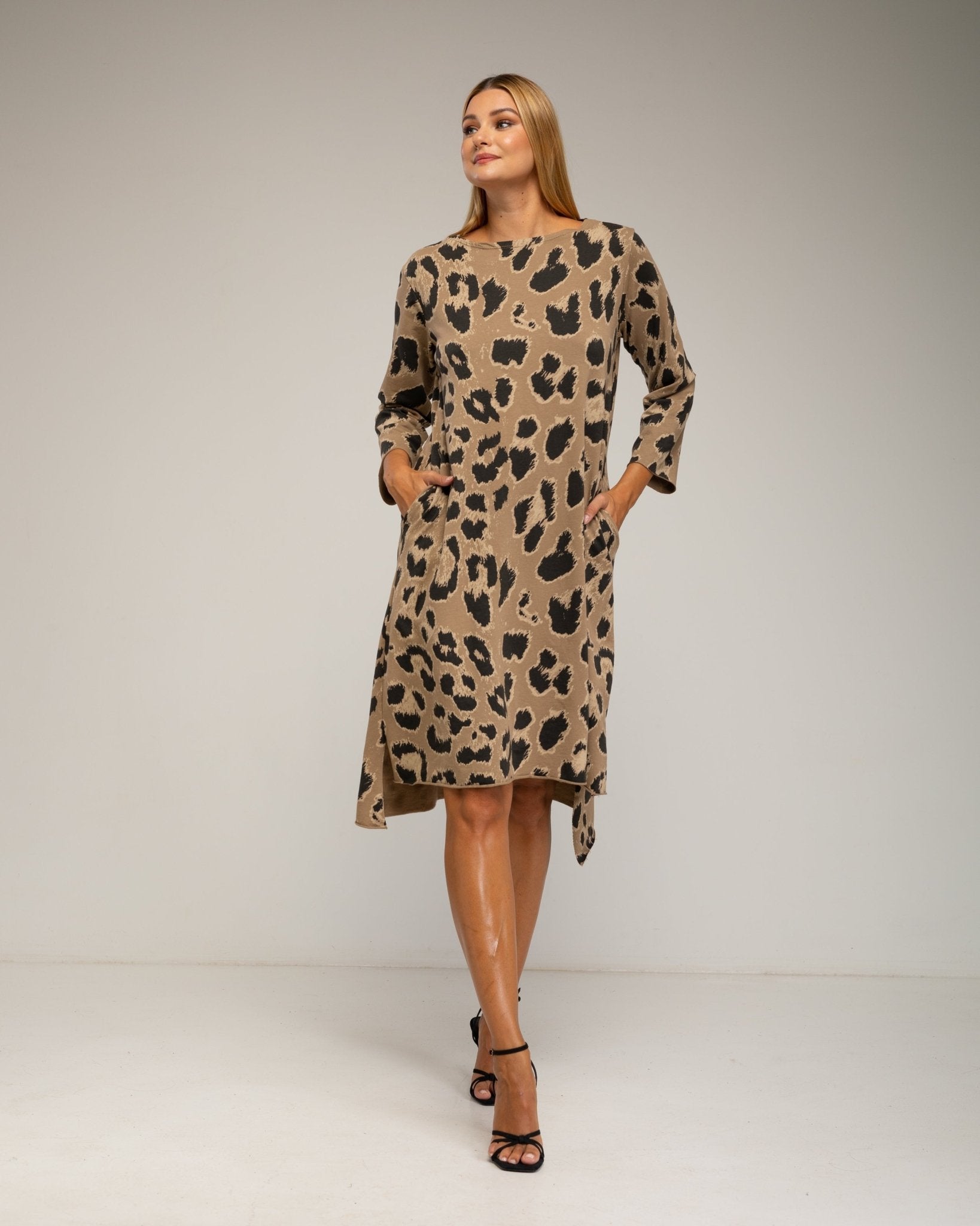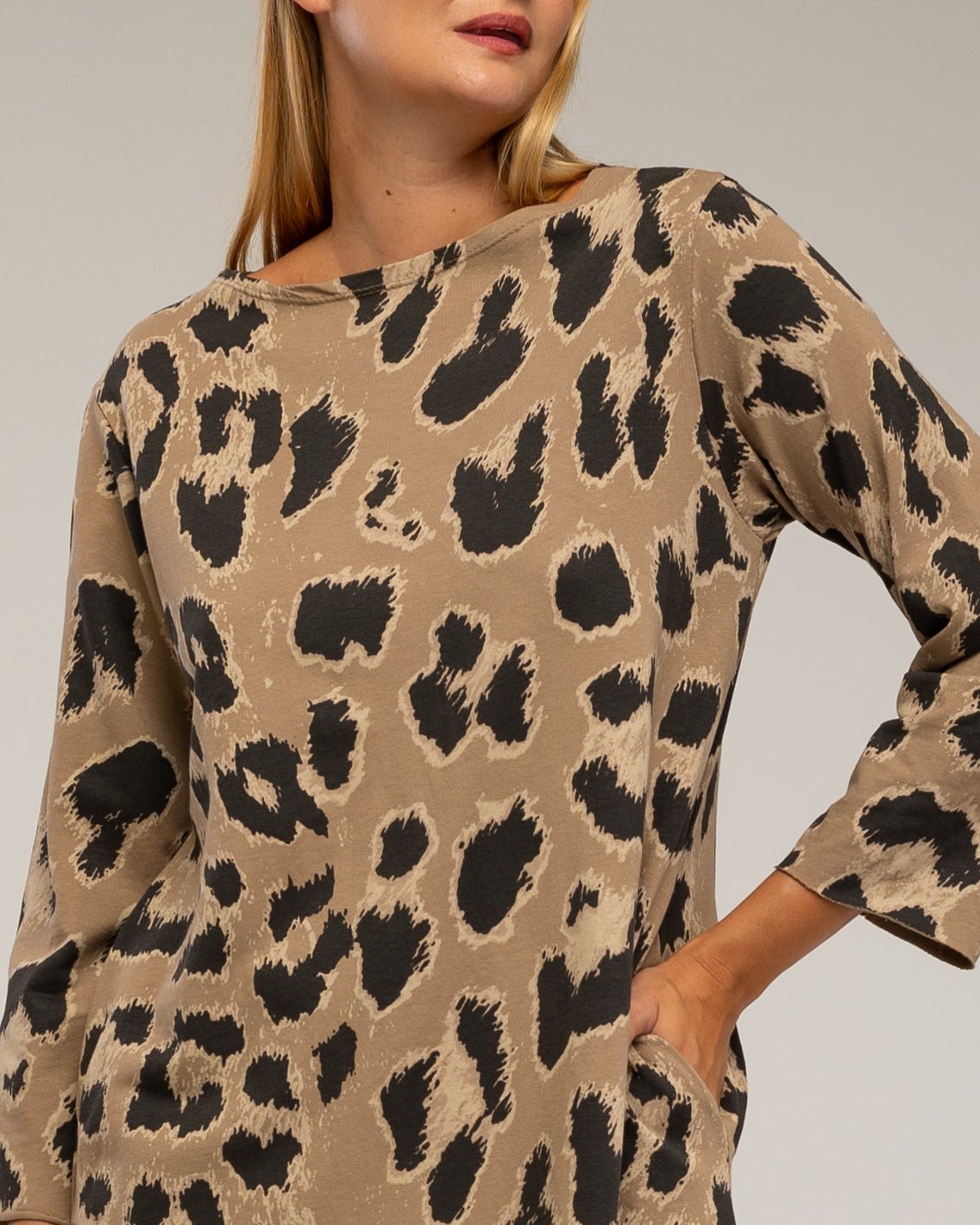 Vestido oversize de estampado animal print, manga larga y bolsillos.